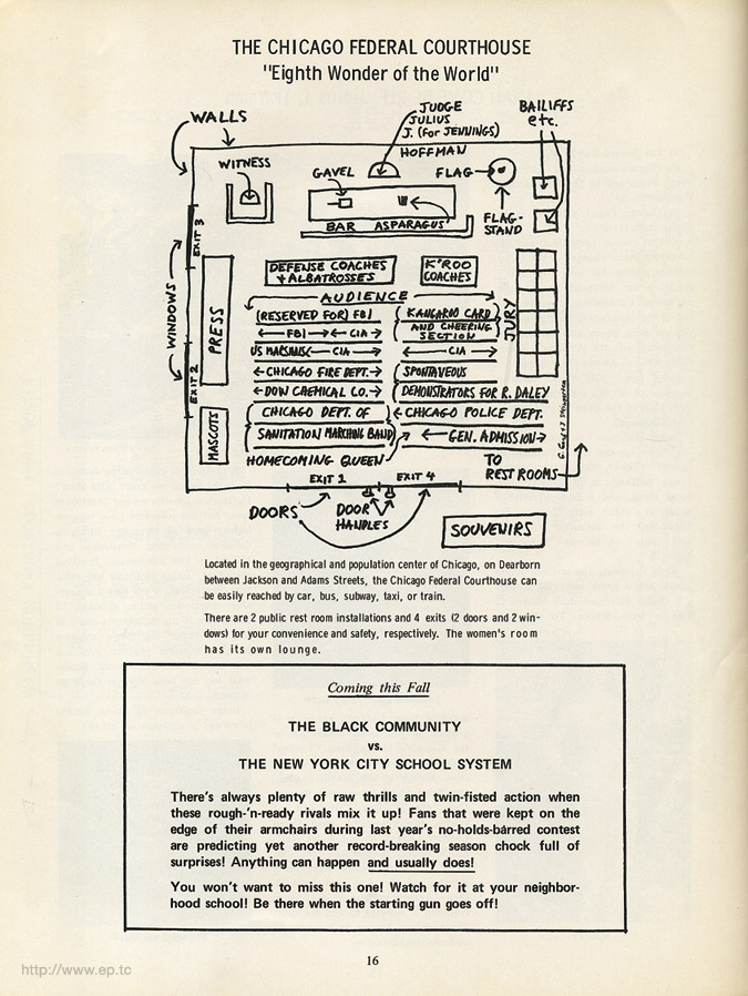 Official program (or pogrom, referring to hunted jews) sold and distributed outside Chicago Federal Courthouse during trial of the Chicago Seven/Eight (Abbie Hoffman, Jerry Rubin, David Dellinger, Tom Hayden, Rennie Davis, John Froines, and Lee Weiner - with Bobby Seale)