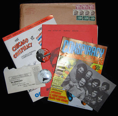 "24 page Official Pogrom" for the Chicago Conspiracy Trial, entitled The Chicago Conspiracy vs. the Washington Kangaroos ... 3) The Trial of Bobby Seale, a red booklet reprinting articles from the New York Review of Books ... 4) Two buttons - one by cartoonist Jules Feiffer entitled: "..seen one judge you've seen them all" and one uncredited entitled: "Screw Magoo". 5) Additional contents include an invitation to: Make a New Year's Revolution, Join the Conspiracy, with a photo of the Chicago seven with their signatures and a business envelope, opened, from from The Conspiracy group itself.