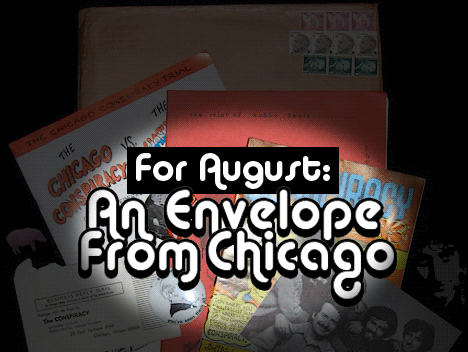 Why are we hyping? Because this is extremely cool history. And as a surviving collection of items we're pretty sure this is completely one of a kind. What we have here is an envelope sent out to a financial supporter of Abbie Hoffman, Jerry Rubin, David Dellinger, Tom Hayden, Rennie Davis, John Froines, Lee Weiner and Bobbie Seale - during the 1969 Chicago Conspiracy Trial.