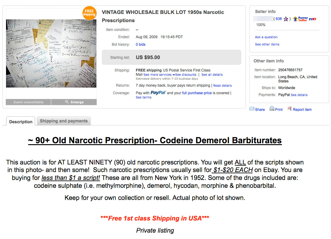 QUOTE: This auction is for AT LEAST NINETY (90) old narcotic prescriptions. You will get ALL of the scripts shown in this photo - and then some! Such narcotic prescriptions usually sell for $1-$20 EACH. You are buying for less than $1 a script! These are all from New York in 1952. Some of the drugs included are: codeine sulphate (i.e. methylmorphine), demerol, hycodan, morphine & phenobarbital.