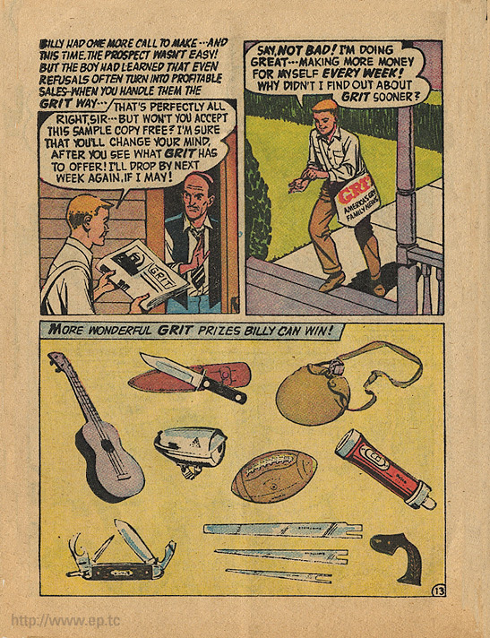 problems home other things on www.ep.tc RSS Facebook COMICS WITH PROBLEMS #47- Supplement Item: "Selling GRIT in 1959 and in 1977" Bit of a fun item here. We were compiling comics related to newspapers for Issue #47 when we picked up what we was assumed to be two issues of the same comic (normally it's a good practice to acquire a copy to scan and another to preserve untouched) A funny surprse when a copy of YOU'VE GOT TO HAVE GRIT arrived with 1959 artwork, and then another arrived with 1977 artwork. And even more amusing when you overlay the two and compare them. So that's what we've decided to do here. You gotta have Grit! Image below is the 1959 version of the GRIT comic book. Roll your mouse over the image to see the 1977 version of the same comic book. Click either image to proceed to the next page. |