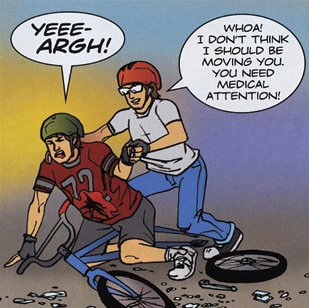 Loss of helmets on playgrounds, (voyeurism of caped avengers), Skulls, Brains, Dogs, Head crashing down on pavement as bike is flipped in air, Laying on the pavement bleeding, loss of skull to expose brain to friends, Crashing through panes of glass, Drawing with CAD, Bicycle tuning, Crashing through a truck, Breaking arm in half with bone cutting through skin and wrist dangling motionlessly, Bloodied knees, Smashing face into a suddenly opened parked car door, Playing horrible sounding rock music, Smashing face first into car door (again), Impaling abdomen with metal from bicycle handlebars, Gaping rifle shot sized hole in abdomen, Broken fingers (all digits twisted in different directions), Soccer, Tire inflation, Wheelies, Smashing into delivery truck, Thrown under truck and having legs cracked and flattened as it bumps over you, Importance of wearing gloves, Running a red light, Being smashed by oncoming car and flipped into air with a loud sound effect, Landing with both legs broken and twisted so horrible knees now bend upwards, Laying on ground with mangled shins and bloodied nose, Building a robot, Running a stop sign, Smashed so hard by a car you are thrown into air where your spine is severed by a metal sign, Landing on the ground and snapping back your neck and twisting your face into the pavement, and Death.