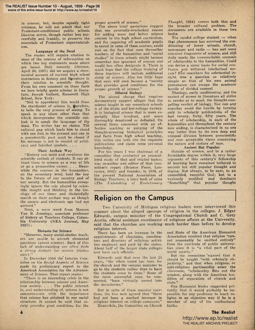 APRIL 1959 CONTENTS: Page 01: The CASE AGAINST SUPERNATURALISM by Oscar Riddle -- Page 02: SIR REALIST -- Page 03: They Said It Couldn't Be Done -- Page 04: A Fable For Our Time -- Page 05 -- Page 06: RELIGION ON THE CAMPUS -- Page 07: The INCREDIBLE SAGA of a PSYCHOQUACK by Harry Kursh -- Page 08 -- Page 09: INSIDE NORMAN VINCENT POLLYANA and INSPIRATIONAL MOVIE MAKING -- Page 10 NEGATIVE THINKING by Robert Anton Wilson, "Detergent Democracy: A New Concept in Clean Government" including THE SOUR STENCH OF SUCCESS -- Page 11 -- Page 12 -- [Centerfold comic strip, "THE FILTERED MAN'S THINKER"] -- Page 13 -- Page 14: The ROAD FROM DAMASCUS by Tom Pease -- Page 15: EQUAL RIGHTS AND DAY NURSERIES and The WOMEN ARE BACK ON THE JOB by Clement Droz -- Page 16 -- Page 17 -- Page 18 -- Page 19: "Please Give Me A New Mummy and Daddy..." by Ethel S. Beer -- Page 20: RELIGIOUS SOCIO-POLITICS AROUND THE WORLD -- Page 21 -- Page 22 -- Page 23 -- BACK COVER: John Francis Putnam's MODEST PROPOSALS