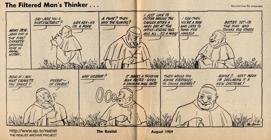 APRIL 1959 CONTENTS: Page 01: The CASE AGAINST SUPERNATURALISM by Oscar Riddle -- Page 02: SIR REALIST -- Page 03: They Said It Couldn't Be Done -- Page 04: A Fable For Our Time -- Page 05 -- Page 06: RELIGION ON THE CAMPUS -- Page 07: The INCREDIBLE SAGA of a PSYCHOQUACK by Harry Kursh -- Page 08 -- Page 09: INSIDE NORMAN VINCENT POLLYANA and INSPIRATIONAL MOVIE MAKING -- Page 10 NEGATIVE THINKING by Robert Anton Wilson, "Detergent Democracy: A New Concept in Clean Government" including THE SOUR STENCH OF SUCCESS -- Page 11 -- Page 12 -- [Centerfold comic strip, "THE FILTERED MAN'S THINKER"] -- Page 13 -- Page 14: The ROAD FROM DAMASCUS by Tom Pease -- Page 15: EQUAL RIGHTS AND DAY NURSERIES and The WOMEN ARE BACK ON THE JOB by Clement Droz -- Page 16 -- Page 17 -- Page 18 -- Page 19: "Please Give Me A New Mummy and Daddy..." by Ethel S. Beer -- Page 20: RELIGIOUS SOCIO-POLITICS AROUND THE WORLD -- Page 21 -- Page 22 -- Page 23 -- BACK COVER: John Francis Putnam's MODEST PROPOSALS