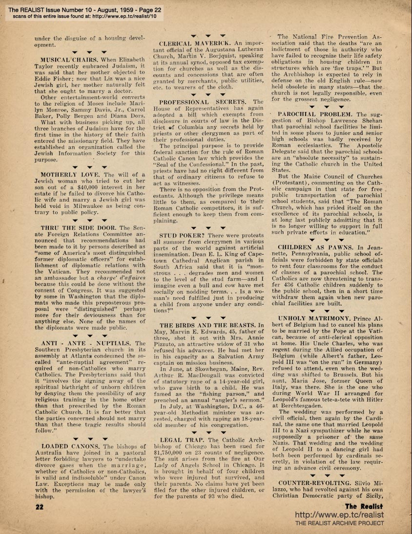 APRIL 1959 CONTENTS: Page 01: The CASE AGAINST SUPERNATURALISM by Oscar Riddle -- Page 02: SIR REALIST -- Page 03: They Said It Couldn't Be Done -- Page 04: A Fable For Our Time -- Page 05 -- Page 06: RELIGION ON THE CAMPUS -- Page 07: The INCREDIBLE SAGA of a PSYCHOQUACK by Harry Kursh -- Page 08 -- Page 09: INSIDE NORMAN VINCENT POLLYANA and INSPIRATIONAL MOVIE MAKING -- Page 10 NEGATIVE THINKING by Robert Anton Wilson, "Detergent Democracy: A New Concept in Clean Government" including THE SOUR STENCH OF SUCCESS -- Page 11 -- Page 12 -- [Centerfold comic strip, "THE FILTERED MAN'S THINKER"] -- Page 13 -- Page 14: The ROAD FROM DAMASCUS by Tom Pease -- Page 15: EQUAL RIGHTS AND DAY NURSERIES and The WOMEN ARE BACK ON THE JOB by Clement Droz -- Page 16 -- Page 17 -- Page 18 -- Page 19: "Please Give Me A New Mummy and Daddy..." by Ethel S. Beer -- Page 20: RELIGIOUS SOCIO-POLITICS AROUND THE WORLD -- Page 21 -- Page 22 -- Page 23 -- BACK COVER: John Francis Putnam's MODEST PROPOSALS
