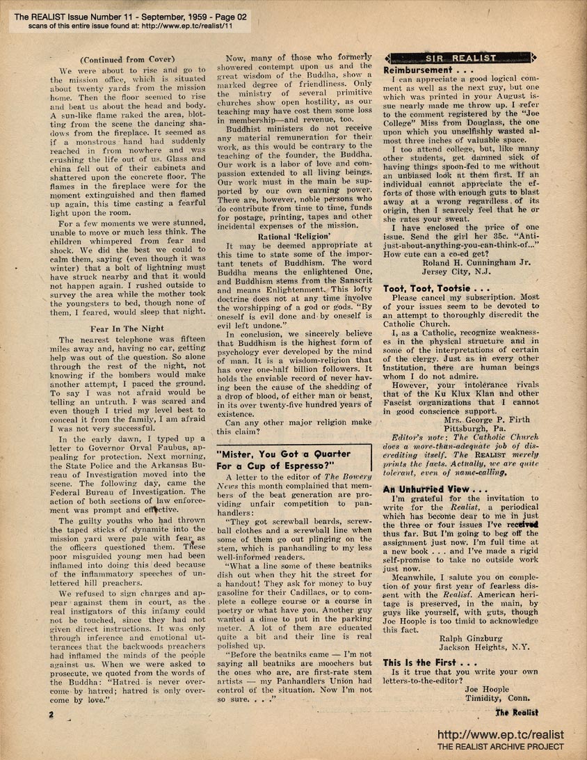SEPTEMBER 1959 CONTENTS: Page 01: THE BOMBING OF A BUDDHIST MISSION by Frank Newton -- Page 02: SIR REALIST -- Page 03: EDITOREALISMS -- Page 04 -- Page 05 -- Page 06 -- Page 07 -- Page 08 -- Page 09: THE TOLERANT PAGAN by Reginald Dunsany -- Page 10 -- Page 11: NEGATIVE THINKING by Robert Anton Wilson -- Page 12 -- Page 13: RELIGIOUS SOCIO-POLITICS AROUND THE WORLD -- Page 14 -- Page 15 -- Page 16: John Francis Putnam's MODEST PROPOSALS