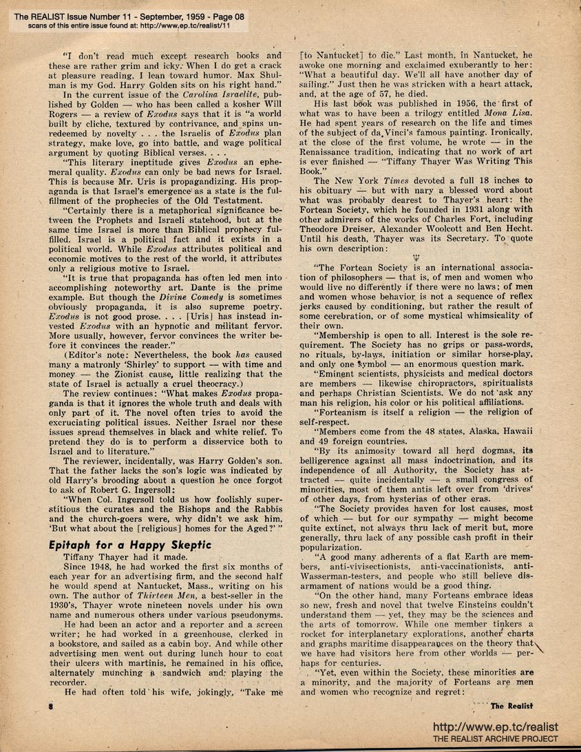 SEPTEMBER 1959 CONTENTS: Page 01: THE BOMBING OF A BUDDHIST MISSION by Frank Newton -- Page 02: SIR REALIST -- Page 03: EDITOREALISMS -- Page 04 -- Page 05 -- Page 06 -- Page 07 -- Page 08 -- Page 09: THE TOLERANT PAGAN by Reginald Dunsany -- Page 10 -- Page 11: NEGATIVE THINKING by Robert Anton Wilson -- Page 12 -- Page 13: RELIGIOUS SOCIO-POLITICS AROUND THE WORLD -- Page 14 -- Page 15 -- Page 16: John Francis Putnam's MODEST PROPOSALS