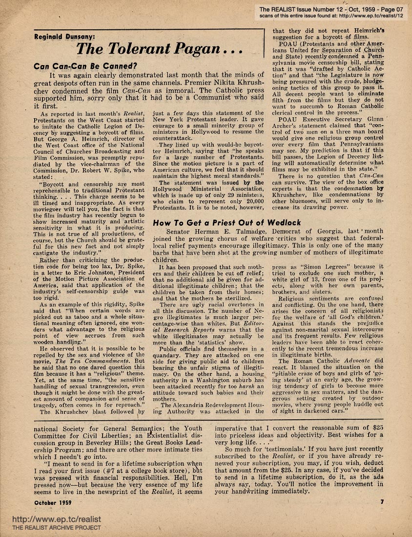 OCTOBER 1959 CONTENTS: Page 01: THE CONVERSION OF GEORGE JEAN NATHAN by James J. Geller -- Page 02: EDITOREALISMS -- Page 03: Ad Nauseam -- Page 04 -- Page 05: Quoted Without Comment -- Page 06 -- Page 07: THE TOLERANT PAGAN by Reginald Dunsany -- Page 08 -- Centerfold Item: When Life Starts -- Page 09 -- Page 10: Negative Thinking: SEX EDUCATION FOR A MODERN LIBERAL ADULT by Robert Anton Wilson -- Page 11: SEX EDUCATION FOR A MODERN CATHOLIC CHILD -- Page 12: "The Churches Ought to Be Able..." -- Page 13: RELIGIOUS SOCIO-POLITICS AROUND THE WORLD -- Page 14 -- Page 15 -- Back Cover