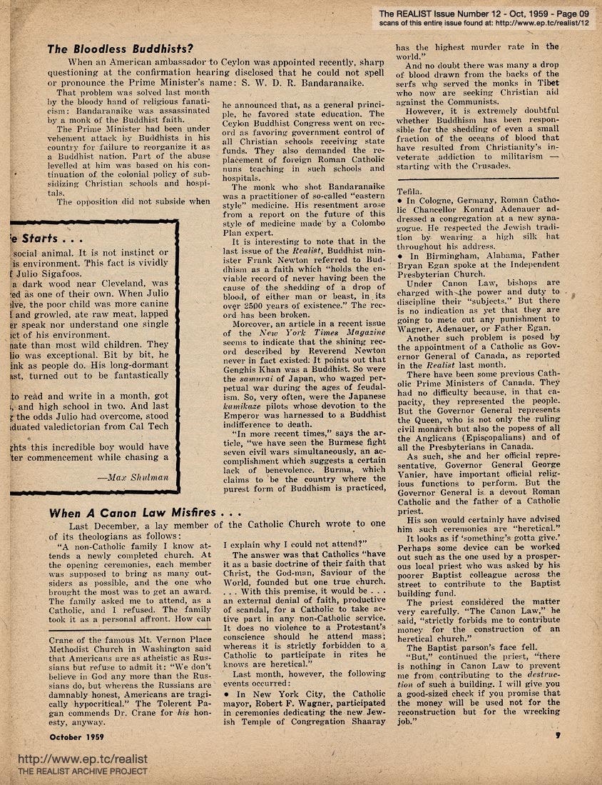 OCTOBER 1959 CONTENTS: Page 01: THE CONVERSION OF GEORGE JEAN NATHAN by James J. Geller -- Page 02: EDITOREALISMS -- Page 03: Ad Nauseam -- Page 04 -- Page 05: Quoted Without Comment -- Page 06 -- Page 07: THE TOLERANT PAGAN by Reginald Dunsany -- Page 08 -- Centerfold Item: When Life Starts -- Page 09 -- Page 10: Negative Thinking: SEX EDUCATION FOR A MODERN LIBERAL ADULT by Robert Anton Wilson -- Page 11: SEX EDUCATION FOR A MODERN CATHOLIC CHILD -- Page 12: "The Churches Ought to Be Able..." -- Page 13: RELIGIOUS SOCIO-POLITICS AROUND THE WORLD -- Page 14 -- Page 15 -- Back Cover