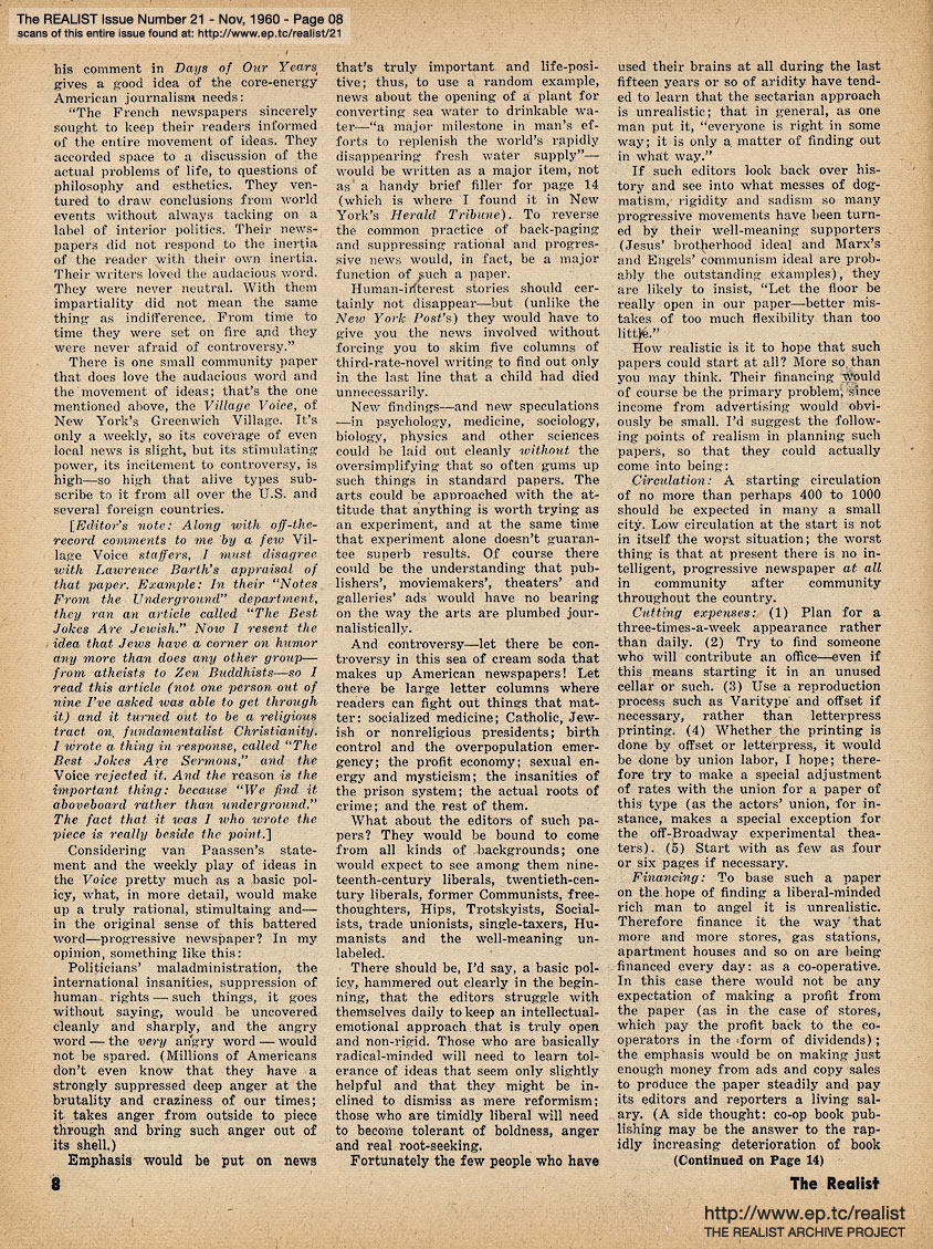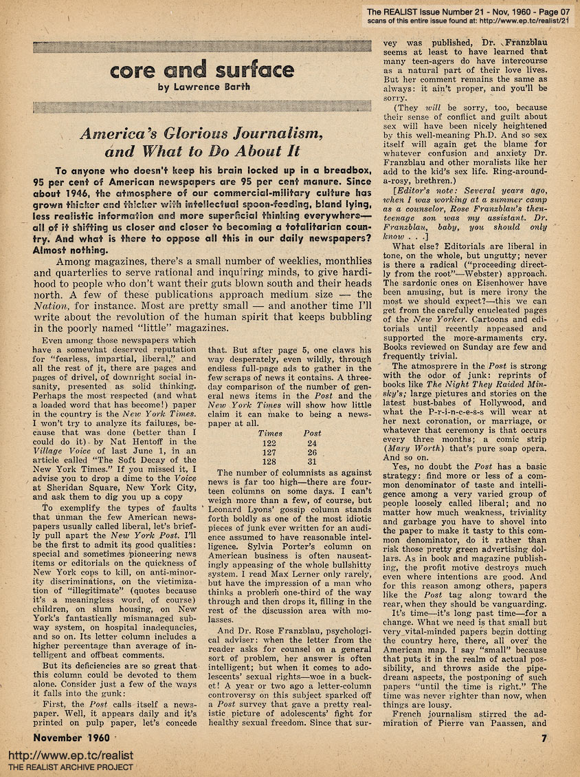 NOVEMBER 1960 CONTENTS: Page 01: THE MYTH OF SPACE TRAVEL AS A SOLUTION TO THE POPULATION PROBLEM by Garrett Hardin, Department of Biological Sciences, University of California -- Page 02: SIR REALIST (letters) and HOW TO WIN VOTES AND INFLUENCE PEDDLERS by Bob Abel -- Page 03: EDITORIAL TYPE STUFF - Cancer and Krebiozen - Interstellar By Starlight - Groupthink - Mother-Loving Carelessness - Santa Claus Is a Fink -- Page 04: Neither For President - A Thought For Thanksgiving - Early Training: One - Contributions -- Page 05: TRAMPOLINES: The Five-Fold Way to Karmic Bliss by Sam Bluefarb -- Page 06 -- Page 07: CORE AND SURFACE by Lawrence Barth, America's Glorious Journalism, and What to Do About It -- Page 08 -- Page 09: KARL MARX SLEPT HERE by Marvin Kitman and WHAT'S THE CATCH by Marshall E. Deutsch -- Page 10 -- Page 11: THE TOLERANT PAGAN by Reginald Dunsany, The Christian Century vs. Sick Humor, and Other Assorted Bits of Battle -- Page 12: SICK JOKE OF THE MONTH -- Page 13: Cartoon: "Ye Must Be Born Again!" by Eric -- Page 14 -- Page 15: IT'S ALL RELATIVE(S) by Darrell Huff -- Back Cover: MODEST PROPOSALS by John Francis Putnam