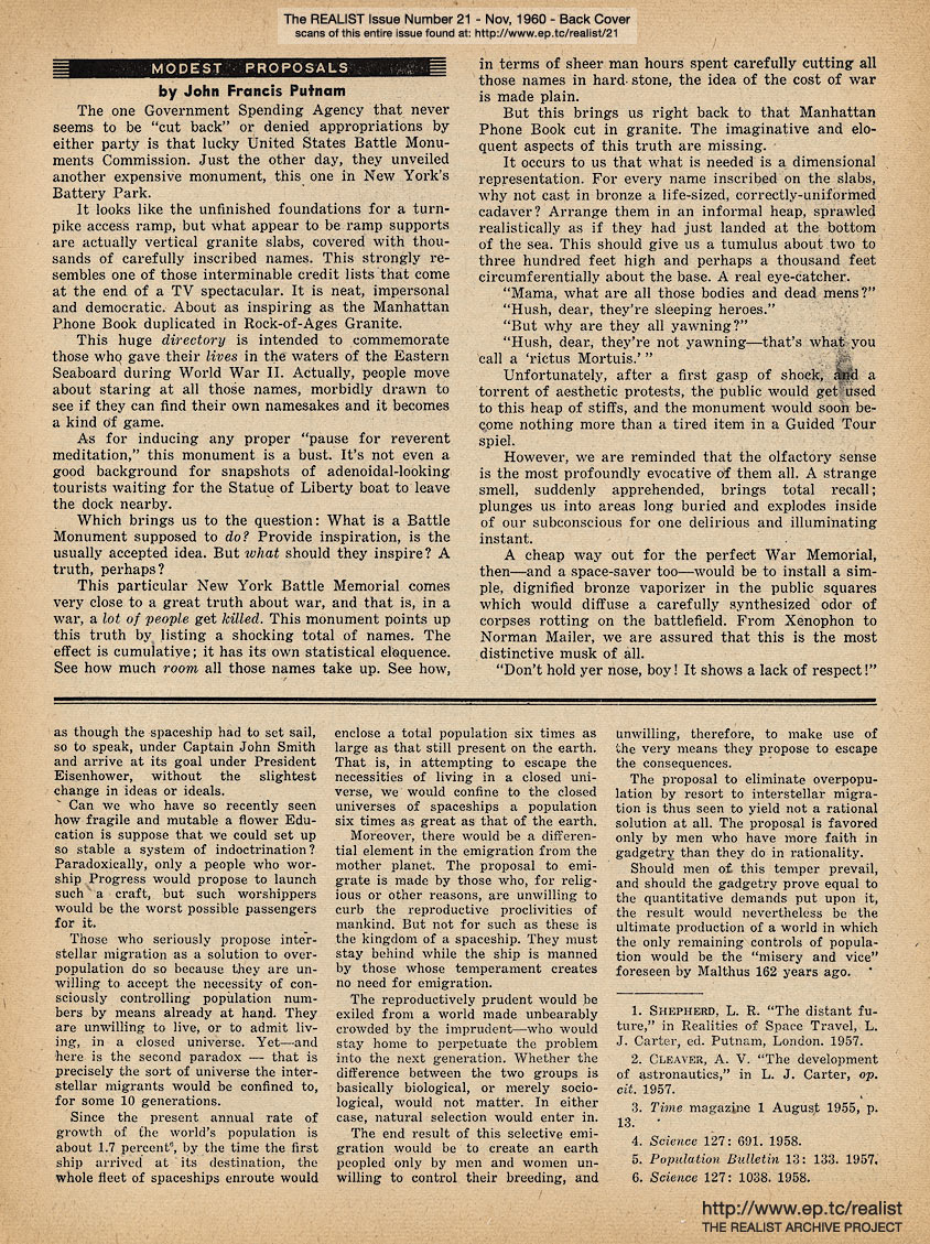NOVEMBER 1960 CONTENTS: Page 01: THE MYTH OF SPACE TRAVEL AS A SOLUTION TO THE POPULATION PROBLEM by Garrett Hardin, Department of Biological Sciences, University of California -- Page 02: SIR REALIST (letters) and HOW TO WIN VOTES AND INFLUENCE PEDDLERS by Bob Abel -- Page 03: EDITORIAL TYPE STUFF - Cancer and Krebiozen - Interstellar By Starlight - Groupthink - Mother-Loving Carelessness - Santa Claus Is a Fink -- Page 04: Neither For President - A Thought For Thanksgiving - Early Training: One - Contributions -- Page 05: TRAMPOLINES: The Five-Fold Way to Karmic Bliss by Sam Bluefarb -- Page 06 -- Page 07: CORE AND SURFACE by Lawrence Barth, America's Glorious Journalism, and What to Do About It -- Page 08 -- Page 09: KARL MARX SLEPT HERE by Marvin Kitman and WHAT'S THE CATCH by Marshall E. Deutsch -- Page 10 -- Page 11: THE TOLERANT PAGAN by Reginald Dunsany, The Christian Century vs. Sick Humor, and Other Assorted Bits of Battle -- Page 12: SICK JOKE OF THE MONTH -- Page 13: Cartoon: "Ye Must Be Born Again!" by Eric -- Page 14 -- Page 15: IT'S ALL RELATIVE(S) by Darrell Huff -- Back Cover: MODEST PROPOSALS by John Francis Putnam