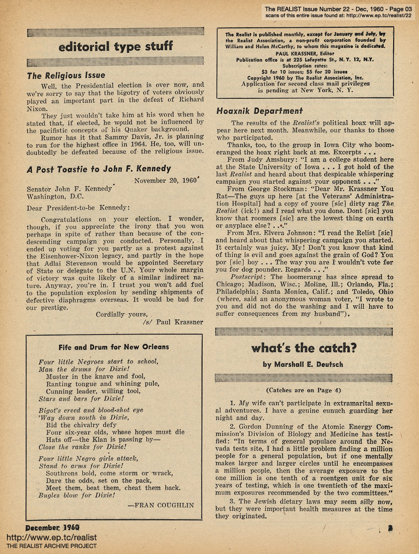 DECEMBER 1960 CONTENTS: Page 01: HELP PUT X BACK IN XMAS - Picture Story: KENNEDY BABY CIRCUMCISED IN WHITE HOUSE CEREMONY - Exclusive Exposé: CLARK GABLE IS FOUND ALIVE IN ARGENTINA - Feature Article: DAVID GREENGLASS TO BE GIVEN BACK HIS OLD GOVERNMENT JOB -- Page 02: REGURGITATIONS FOR THE HOLIDAY SEASON by Bob Abel -- Page 03: EDITORIAL TYPE STUFF - The Religious Issue - A Post Toastie to John F. Kennedy - FIFE AND DRUM FOR NEW ORLEANS by Fran Coughlin - and WHAT'S THE CATCH? by Marshall E. Deutsch -- Page 04: Early Training: Two - The Wife-Knifer (Norman Mailer) - Returning Next Issue - The Lord's Finger Job - Eavesdropping Department - If You Have Nothing Better to Do -- Page 05: NEGATIVE THINKING by Robert Anton Wilson, "The New Art of the Brave" (on Norman Mailer) -- Page 06 -- Page 07: CORE AND SURFACE by Lawrence Barth and SIGN OF THE (EQUAL) TIMES -- Page 08 -- Centerfold Image -- Page 09 -- Page 10: "LOOK MA ... NO HANDS!" and A PSYCHOLOGIST TAKES THE STAND by Norvin Pallas -- Page 11 -- Page 12: RELIGIOUS EXPERIENCE and THE MATHEMATIC OF HAPPINESS by Jean Dutourd -- Page 13: THE REALIST SEAL OF APPROVAL and NEMESIS OF ALL NEPOTISM -- Page 14: NOT EVERYBODY LOVES "THE LOVERS" - Revelation of the Month - Advice to the Lovelorn - Horse Meat and Matzoh Meal - and SHADOWS MOVE AMONG THEM -- Page 15: SIR REALIST (letters) -- Back Cover: LENNY BRUCE REVISITED by Paul Krassner