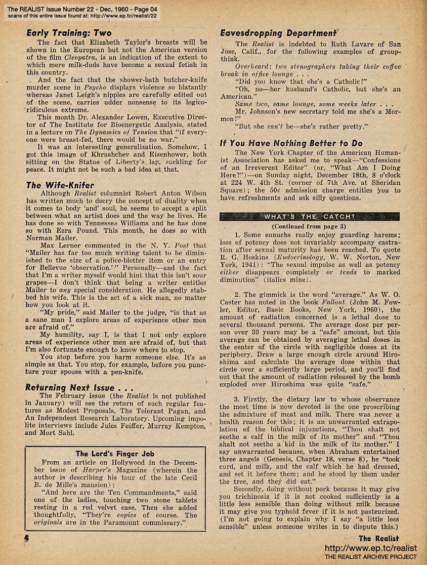 DECEMBER 1960 CONTENTS: Page 01: HELP PUT X BACK IN XMAS - Picture Story: KENNEDY BABY CIRCUMCISED IN WHITE HOUSE CEREMONY - Exclusive Exposé: CLARK GABLE IS FOUND ALIVE IN ARGENTINA - Feature Article: DAVID GREENGLASS TO BE GIVEN BACK HIS OLD GOVERNMENT JOB -- Page 02: REGURGITATIONS FOR THE HOLIDAY SEASON by Bob Abel -- Page 03: EDITORIAL TYPE STUFF - The Religious Issue - A Post Toastie to John F. Kennedy - FIFE AND DRUM FOR NEW ORLEANS by Fran Coughlin - and WHAT'S THE CATCH? by Marshall E. Deutsch -- Page 04: Early Training: Two - The Wife-Knifer (Norman Mailer) - Returning Next Issue - The Lord's Finger Job - Eavesdropping Department - If You Have Nothing Better to Do -- Page 05: NEGATIVE THINKING by Robert Anton Wilson, "The New Art of the Brave" (on Norman Mailer) -- Page 06 -- Page 07: CORE AND SURFACE by Lawrence Barth and SIGN OF THE (EQUAL) TIMES -- Page 08 -- Centerfold Image -- Page 09 -- Page 10: "LOOK MA ... NO HANDS!" and A PSYCHOLOGIST TAKES THE STAND by Norvin Pallas -- Page 11 -- Page 12: RELIGIOUS EXPERIENCE and THE MATHEMATIC OF HAPPINESS by Jean Dutourd -- Page 13: THE REALIST SEAL OF APPROVAL and NEMESIS OF ALL NEPOTISM -- Page 14: NOT EVERYBODY LOVES "THE LOVERS" - Revelation of the Month - Advice to the Lovelorn - Horse Meat and Matzoh Meal - and SHADOWS MOVE AMONG THEM -- Page 15: SIR REALIST (letters) -- Back Cover: LENNY BRUCE REVISITED by Paul Krassner