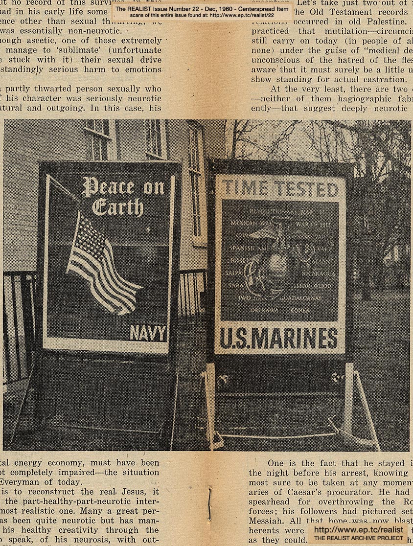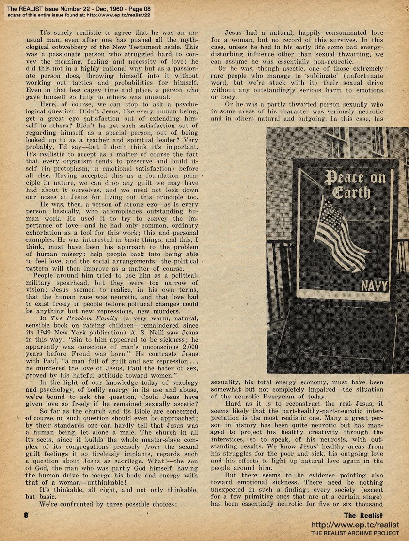 DECEMBER 1960 CONTENTS: Page 01: HELP PUT X BACK IN XMAS - Picture Story: KENNEDY BABY CIRCUMCISED IN WHITE HOUSE CEREMONY - Exclusive Exposé: CLARK GABLE IS FOUND ALIVE IN ARGENTINA - Feature Article: DAVID GREENGLASS TO BE GIVEN BACK HIS OLD GOVERNMENT JOB -- Page 02: REGURGITATIONS FOR THE HOLIDAY SEASON by Bob Abel -- Page 03: EDITORIAL TYPE STUFF - The Religious Issue - A Post Toastie to John F. Kennedy - FIFE AND DRUM FOR NEW ORLEANS by Fran Coughlin - and WHAT'S THE CATCH? by Marshall E. Deutsch -- Page 04: Early Training: Two - The Wife-Knifer (Norman Mailer) - Returning Next Issue - The Lord's Finger Job - Eavesdropping Department - If You Have Nothing Better to Do -- Page 05: NEGATIVE THINKING by Robert Anton Wilson, "The New Art of the Brave" (on Norman Mailer) -- Page 06 -- Page 07: CORE AND SURFACE by Lawrence Barth and SIGN OF THE (EQUAL) TIMES -- Page 08 -- Centerfold Image -- Page 09 -- Page 10: "LOOK MA ... NO HANDS!" and A PSYCHOLOGIST TAKES THE STAND by Norvin Pallas -- Page 11 -- Page 12: RELIGIOUS EXPERIENCE and THE MATHEMATIC OF HAPPINESS by Jean Dutourd -- Page 13: THE REALIST SEAL OF APPROVAL and NEMESIS OF ALL NEPOTISM -- Page 14: NOT EVERYBODY LOVES "THE LOVERS" - Revelation of the Month - Advice to the Lovelorn - Horse Meat and Matzoh Meal - and SHADOWS MOVE AMONG THEM -- Page 15: SIR REALIST (letters) -- Back Cover: LENNY BRUCE REVISITED by Paul Krassner