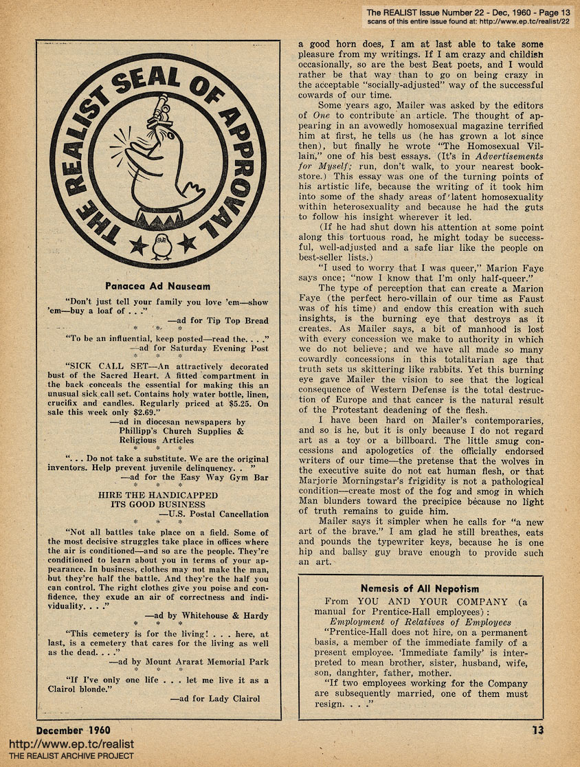 Also: Separate pieces from Paul Krassner and Robert Anton Wilson on The Norman Mailer Knife-Wifing Incident- December 1960