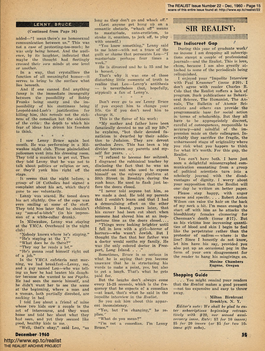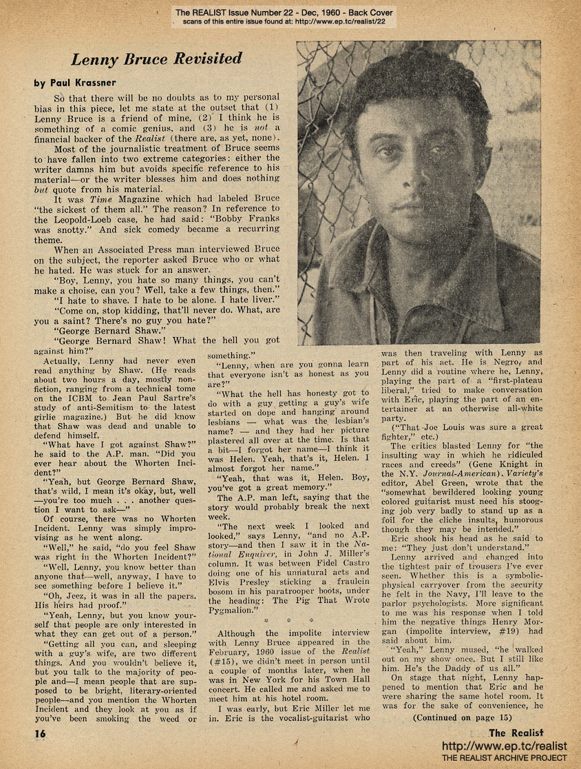 DECEMBER 1960 CONTENTS: Page 01: HELP PUT X BACK IN XMAS - Picture Story: KENNEDY BABY CIRCUMCISED IN WHITE HOUSE CEREMONY - Exclusive Exposé: CLARK GABLE IS FOUND ALIVE IN ARGENTINA - Feature Article: DAVID GREENGLASS TO BE GIVEN BACK HIS OLD GOVERNMENT JOB -- Page 02: REGURGITATIONS FOR THE HOLIDAY SEASON by Bob Abel -- Page 03: EDITORIAL TYPE STUFF - The Religious Issue - A Post Toastie to John F. Kennedy - FIFE AND DRUM FOR NEW ORLEANS by Fran Coughlin - and WHAT'S THE CATCH? by Marshall E. Deutsch -- Page 04: Early Training: Two - The Wife-Knifer (Norman Mailer) - Returning Next Issue - The Lord's Finger Job - Eavesdropping Department - If You Have Nothing Better to Do -- Page 05: NEGATIVE THINKING by Robert Anton Wilson, "The New Art of the Brave" (on Norman Mailer) -- Page 06 -- Page 07: CORE AND SURFACE by Lawrence Barth and SIGN OF THE (EQUAL) TIMES -- Page 08 -- Centerfold Image -- Page 09 -- Page 10: "LOOK MA ... NO HANDS!" and A PSYCHOLOGIST TAKES THE STAND by Norvin Pallas -- Page 11 -- Page 12: RELIGIOUS EXPERIENCE and THE MATHEMATIC OF HAPPINESS by Jean Dutourd -- Page 13: THE REALIST SEAL OF APPROVAL and NEMESIS OF ALL NEPOTISM -- Page 14: NOT EVERYBODY LOVES "THE LOVERS" - Revelation of the Month - Advice to the Lovelorn - Horse Meat and Matzoh Meal - and SHADOWS MOVE AMONG THEM -- Page 15: SIR REALIST (letters) -- Back Cover: LENNY BRUCE REVISITED by Paul Krassner