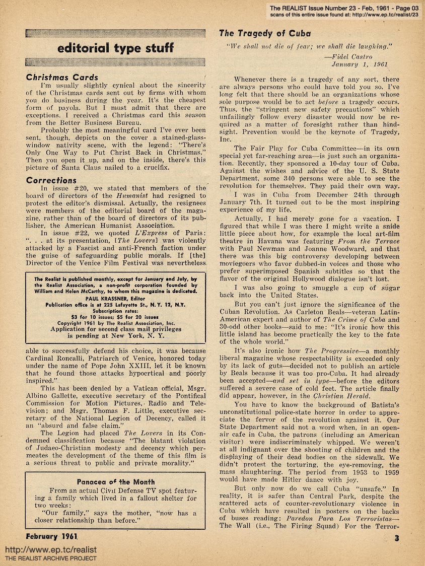 FEBRUARY 1961 CONTENTS: Page 01: AN IMPOLITE INTERVIEW WITH JULES FEIFFER -- Page 02: SIR REALIST (letters) -- Page 03: EDITORIAL TYPE STUFF - Christmas Cards - Corrections - Panacea of the Month - The Tragedy of Cuba -- Page 04: Impropaganda -- Page 05: Soft Sell and Hard Hearts -- Page 06: Conservative Humor (with William F. Buckley) - No, But I Saw the Movie - Verifications -- Page 07: OPERATION FREEDOM - REPORT ON A VISIT TO FAYETTE AND HAYWOOD COUNTIES, TENNESSEE by Ross Anderson, Wallace Nelson and Maurice McCrackin -- Page 08: Idealism of the Month -- Page 09: REPORT FROM AN INDEPENDENT RESEARCH LABORATORY by Marvin Kitman -- Page 10: A TALE OF TWO LADIES -- AND AN EX-GIRLFRIEND by Bob Abel -- Page 11: ANTI-CLERICALISM IN CUBA -- Page 12 -- Center: Jules Feiffer Cartoon -- Page 13 -- Page 14: Realist of the Month and Eavesdropping of the Month -- Page 15: POLITICAL BOUQUETS FOR 1960 by Sidney Bernard -- Page 16: IMAGE OF A PRESIDENT -- Page 17: MALICE IN WONDERLAND by Madelyn E. Murray and THE ADVENTURES OF CHURCHMAN by Bob Margolin and Mickey Gruber -- Page 18 -- Page 19 -- Page 20 -- Page 21 -- Page 22 -- Page 23: Listing of Back Issues -- Back Cover: MODEST PROPOSALS by John Francis Putnam