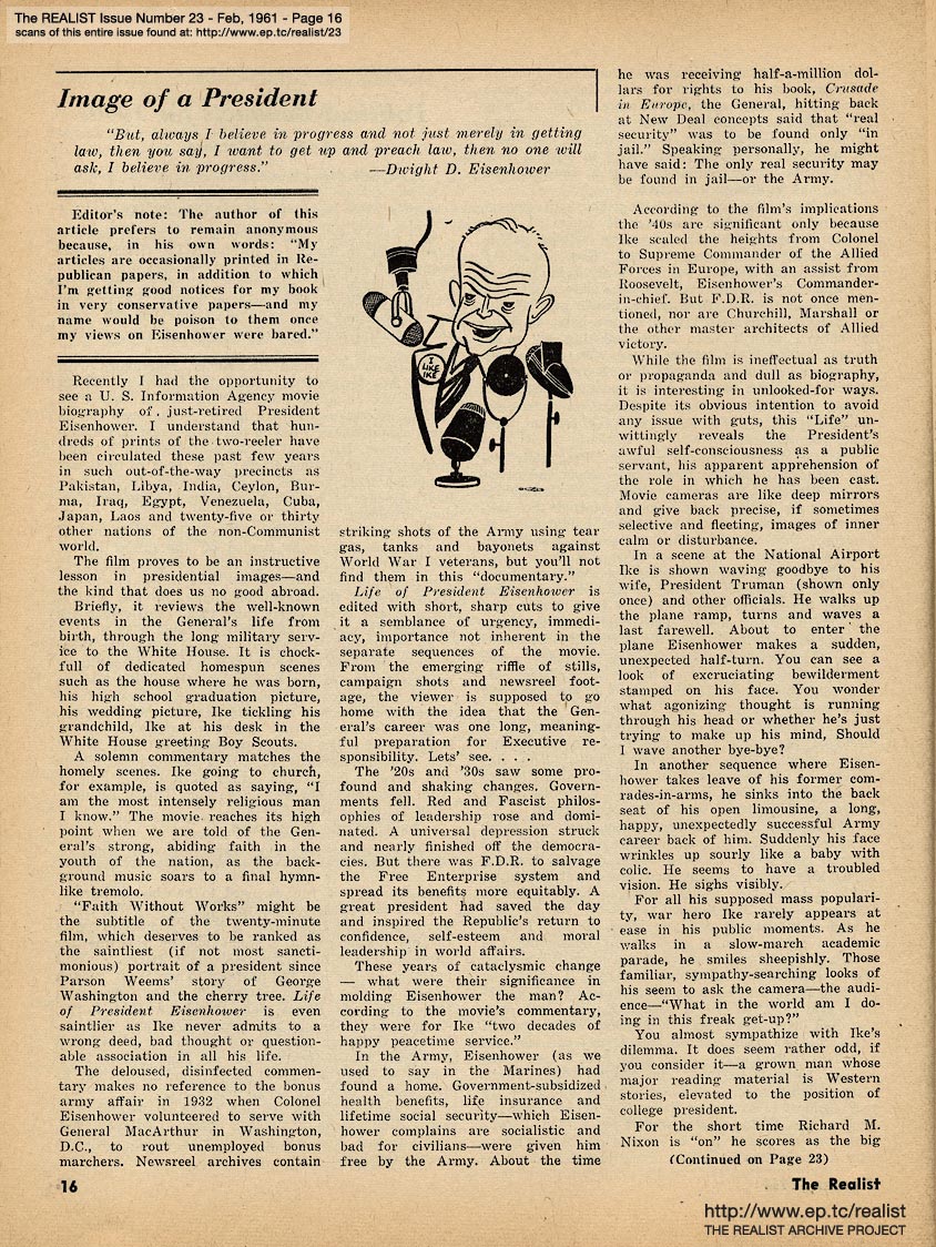 FEBRUARY 1961 CONTENTS: Page 01: AN IMPOLITE INTERVIEW WITH JULES FEIFFER -- Page 02: SIR REALIST (letters) -- Page 03: EDITORIAL TYPE STUFF - Christmas Cards - Corrections - Panacea of the Month - The Tragedy of Cuba -- Page 04: Impropaganda -- Page 05: Soft Sell and Hard Hearts -- Page 06: Conservative Humor (with William F. Buckley) - No, But I Saw the Movie - Verifications -- Page 07: OPERATION FREEDOM - REPORT ON A VISIT TO FAYETTE AND HAYWOOD COUNTIES, TENNESSEE by Ross Anderson, Wallace Nelson and Maurice McCrackin -- Page 08: Idealism of the Month -- Page 09: REPORT FROM AN INDEPENDENT RESEARCH LABORATORY by Marvin Kitman -- Page 10: A TALE OF TWO LADIES -- AND AN EX-GIRLFRIEND by Bob Abel -- Page 11: ANTI-CLERICALISM IN CUBA -- Page 12 -- Center: Jules Feiffer Cartoon -- Page 13 -- Page 14: Realist of the Month and Eavesdropping of the Month -- Page 15: POLITICAL BOUQUETS FOR 1960 by Sidney Bernard -- Page 16: IMAGE OF A PRESIDENT -- Page 17: MALICE IN WONDERLAND by Madelyn E. Murray and THE ADVENTURES OF CHURCHMAN by Bob Margolin and Mickey Gruber -- Page 18 -- Page 19 -- Page 20 -- Page 21 -- Page 22 -- Page 23: Listing of Back Issues -- Back Cover: MODEST PROPOSALS by John Francis Putnam