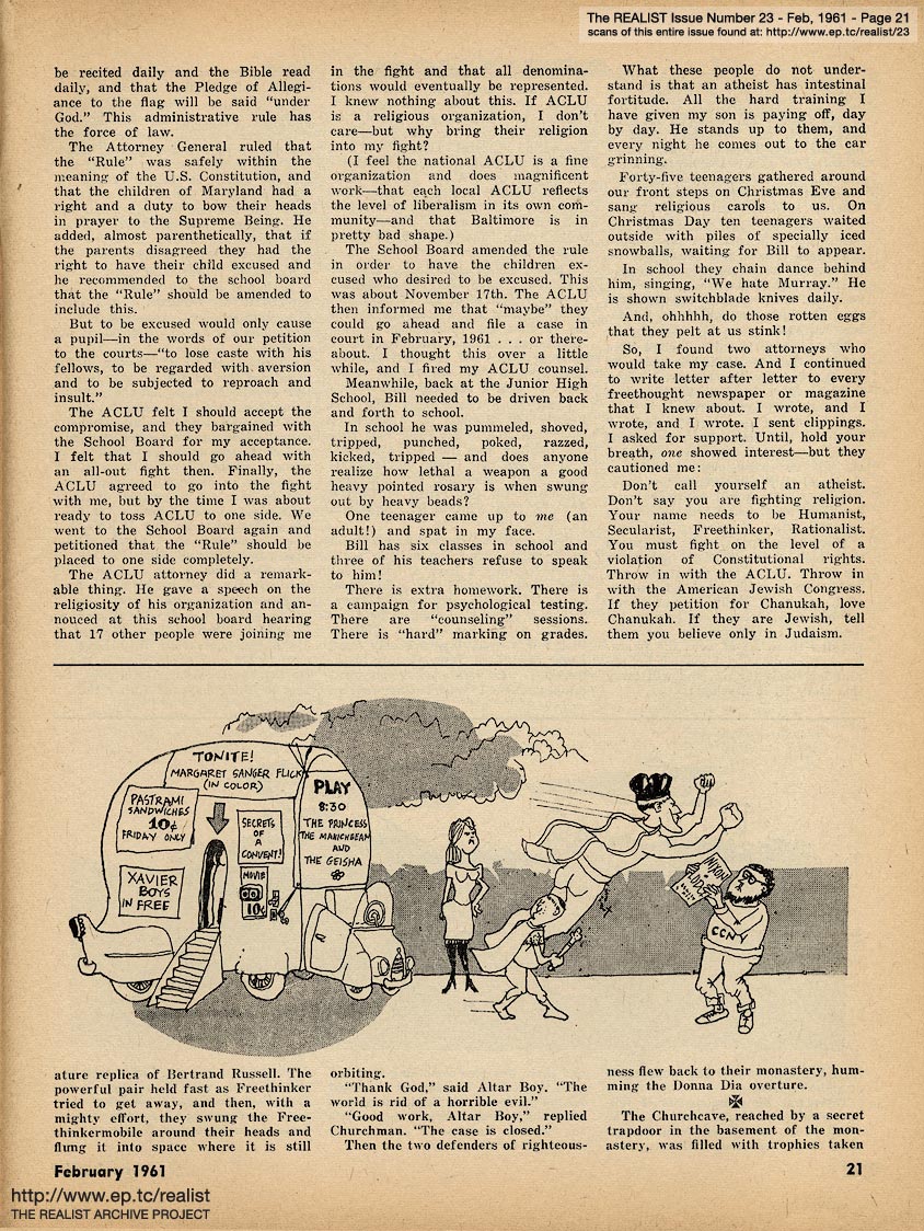 FEBRUARY 1961 CONTENTS: Page 01: AN IMPOLITE INTERVIEW WITH JULES FEIFFER -- Page 02: SIR REALIST (letters) -- Page 03: EDITORIAL TYPE STUFF - Christmas Cards - Corrections - Panacea of the Month - The Tragedy of Cuba -- Page 04: Impropaganda -- Page 05: Soft Sell and Hard Hearts -- Page 06: Conservative Humor (with William F. Buckley) - No, But I Saw the Movie - Verifications -- Page 07: OPERATION FREEDOM - REPORT ON A VISIT TO FAYETTE AND HAYWOOD COUNTIES, TENNESSEE by Ross Anderson, Wallace Nelson and Maurice McCrackin -- Page 08: Idealism of the Month -- Page 09: REPORT FROM AN INDEPENDENT RESEARCH LABORATORY by Marvin Kitman -- Page 10: A TALE OF TWO LADIES -- AND AN EX-GIRLFRIEND by Bob Abel -- Page 11: ANTI-CLERICALISM IN CUBA -- Page 12 -- Center: Jules Feiffer Cartoon -- Page 13 -- Page 14: Realist of the Month and Eavesdropping of the Month -- Page 15: POLITICAL BOUQUETS FOR 1960 by Sidney Bernard -- Page 16: IMAGE OF A PRESIDENT -- Page 17: MALICE IN WONDERLAND by Madelyn E. Murray and THE ADVENTURES OF CHURCHMAN by Bob Margolin and Mickey Gruber -- Page 18 -- Page 19 -- Page 20 -- Page 21 -- Page 22 -- Page 23: Listing of Back Issues -- Back Cover: MODEST PROPOSALS by John Francis Putnam