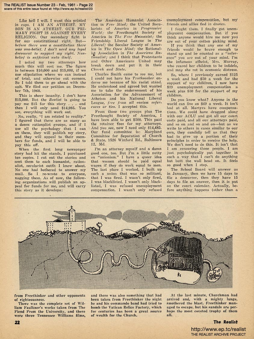 FEBRUARY 1961 CONTENTS: Page 01: AN IMPOLITE INTERVIEW WITH JULES FEIFFER -- Page 02: SIR REALIST (letters) -- Page 03: EDITORIAL TYPE STUFF - Christmas Cards - Corrections - Panacea of the Month - The Tragedy of Cuba -- Page 04: Impropaganda -- Page 05: Soft Sell and Hard Hearts -- Page 06: Conservative Humor (with William F. Buckley) - No, But I Saw the Movie - Verifications -- Page 07: OPERATION FREEDOM - REPORT ON A VISIT TO FAYETTE AND HAYWOOD COUNTIES, TENNESSEE by Ross Anderson, Wallace Nelson and Maurice McCrackin -- Page 08: Idealism of the Month -- Page 09: REPORT FROM AN INDEPENDENT RESEARCH LABORATORY by Marvin Kitman -- Page 10: A TALE OF TWO LADIES -- AND AN EX-GIRLFRIEND by Bob Abel -- Page 11: ANTI-CLERICALISM IN CUBA -- Page 12 -- Center: Jules Feiffer Cartoon -- Page 13 -- Page 14: Realist of the Month and Eavesdropping of the Month -- Page 15: POLITICAL BOUQUETS FOR 1960 by Sidney Bernard -- Page 16: IMAGE OF A PRESIDENT -- Page 17: MALICE IN WONDERLAND by Madelyn E. Murray and THE ADVENTURES OF CHURCHMAN by Bob Margolin and Mickey Gruber -- Page 18 -- Page 19 -- Page 20 -- Page 21 -- Page 22 -- Page 23: Listing of Back Issues -- Back Cover: MODEST PROPOSALS by John Francis Putnam