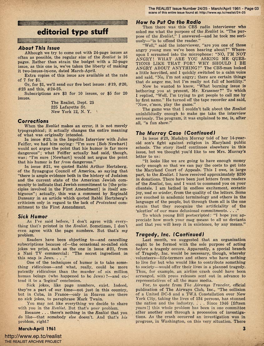 MARCH/APRIL 1961 CONTENTS: Page 01: COLLEGE TEACHER IN MISSISSIPPI by Dave Berkman and POLITICAL PRISONERS IN FRANCO'S SPAIN -- Page 02: SIR REALIST -- Page 03: EDITORIAL TYPE STUFF -- Page 04 -- Page 05 -- Page 06 -- Page 07: FRANCO'S PRISONERS SPEAK (Continued from Cover) -- Page 08 -- Page 09 -- Page 10 -- Page 11: THE CASE OF DAMIAN ECUDER LLADO -- Page 12 -- Page 13: even if you never see another movie, please don't reveal the ending of ... PSYCHITA -- Page 14 -- Page 15: COLLEGE TEACHER IN MISSISSIPPI (Continued from Cover) and RUMORS OF THE MONTH -- Page 16 -- Centerfold Item: "Mary Had a Little Lamb" by Shoemaker -- Page 17 -- Page 18 -- Page 19: OF DOLLS AND DREAMS ... by Bob Margolin -- Page 20: JIMCROW HUMOR -- Page 21: THE LIBIDO OF A CONSERVATIVE by Garry Boldwater (as told to Herbert Swartz) -- Page 22 -- Page 23: DEPARTMENT OF UNINTENTIONAL SATIRE -- Page 24: OUT IN LEFT FIELD WITHOUT A BAT by James Higgins -- Page 25: Excerpt from a TV audience participation program - IT COULD BE YOUR LIFE TO TELL THE TRUTH OR CONSEQUENCES ARE FUNNY -- Page 26: COLUMNY by John Wilcock -- Page 27 -- Page 28: MORE MALICE IN MARYLAND by Madalyn E. Murray -- Page 29: An Editorial Footnote by Paul Krassner -- Page 30: CASE HISTORY OF A POLITICAL HOAX and LENNY BRUCE ON THE GREAT DEBATE -- Page 31: A QUARTERLY REPORT ON SOME OF THE CRAP THAT'S BEEN GOING ON by Bob Abel -- Page 32: QUERY OF THE MONTH