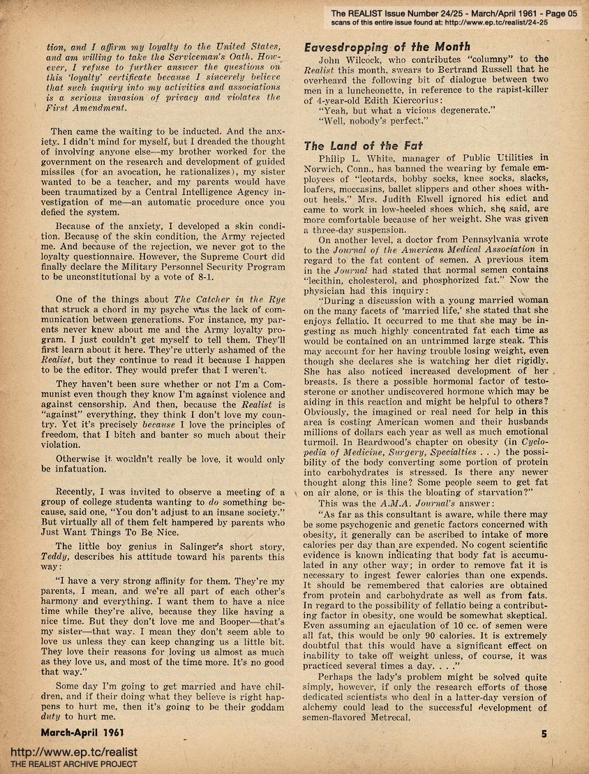 MARCH/APRIL 1961 CONTENTS: Page 01: COLLEGE TEACHER IN MISSISSIPPI by Dave Berkman and POLITICAL PRISONERS IN FRANCO'S SPAIN -- Page 02: SIR REALIST -- Page 03: EDITORIAL TYPE STUFF -- Page 04 -- Page 05 -- Page 06 -- Page 07: FRANCO'S PRISONERS SPEAK (Continued from Cover) -- Page 08 -- Page 09 -- Page 10 -- Page 11: THE CASE OF DAMIAN ECUDER LLADO -- Page 12 -- Page 13: even if you never see another movie, please don't reveal the ending of ... PSYCHITA -- Page 14 -- Page 15: COLLEGE TEACHER IN MISSISSIPPI (Continued from Cover) and RUMORS OF THE MONTH -- Page 16 -- Centerfold Item: "Mary Had a Little Lamb" by Shoemaker -- Page 17 -- Page 18 -- Page 19: OF DOLLS AND DREAMS ... by Bob Margolin -- Page 20: JIMCROW HUMOR -- Page 21: THE LIBIDO OF A CONSERVATIVE by Garry Boldwater (as told to Herbert Swartz) -- Page 22 -- Page 23: DEPARTMENT OF UNINTENTIONAL SATIRE -- Page 24: OUT IN LEFT FIELD WITHOUT A BAT by James Higgins -- Page 25: Excerpt from a TV audience participation program - IT COULD BE YOUR LIFE TO TELL THE TRUTH OR CONSEQUENCES ARE FUNNY -- Page 26: COLUMNY by John Wilcock -- Page 27 -- Page 28: MORE MALICE IN MARYLAND by Madalyn E. Murray -- Page 29: An Editorial Footnote by Paul Krassner -- Page 30: CASE HISTORY OF A POLITICAL HOAX and LENNY BRUCE ON THE GREAT DEBATE -- Page 31: A QUARTERLY REPORT ON SOME OF THE CRAP THAT'S BEEN GOING ON by Bob Abel -- Page 32: QUERY OF THE MONTH