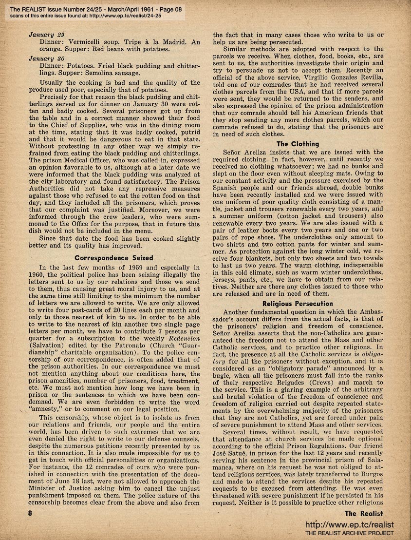MARCH/APRIL 1961 CONTENTS: Page 01: COLLEGE TEACHER IN MISSISSIPPI by Dave Berkman and POLITICAL PRISONERS IN FRANCO'S SPAIN -- Page 02: SIR REALIST -- Page 03: EDITORIAL TYPE STUFF -- Page 04 -- Page 05 -- Page 06 -- Page 07: FRANCO'S PRISONERS SPEAK (Continued from Cover) -- Page 08 -- Page 09 -- Page 10 -- Page 11: THE CASE OF DAMIAN ECUDER LLADO -- Page 12 -- Page 13: even if you never see another movie, please don't reveal the ending of ... PSYCHITA -- Page 14 -- Page 15: COLLEGE TEACHER IN MISSISSIPPI (Continued from Cover) and RUMORS OF THE MONTH -- Page 16 -- Centerfold Item: "Mary Had a Little Lamb" by Shoemaker -- Page 17 -- Page 18 -- Page 19: OF DOLLS AND DREAMS ... by Bob Margolin -- Page 20: JIMCROW HUMOR -- Page 21: THE LIBIDO OF A CONSERVATIVE by Garry Boldwater (as told to Herbert Swartz) -- Page 22 -- Page 23: DEPARTMENT OF UNINTENTIONAL SATIRE -- Page 24: OUT IN LEFT FIELD WITHOUT A BAT by James Higgins -- Page 25: Excerpt from a TV audience participation program - IT COULD BE YOUR LIFE TO TELL THE TRUTH OR CONSEQUENCES ARE FUNNY -- Page 26: COLUMNY by John Wilcock -- Page 27 -- Page 28: MORE MALICE IN MARYLAND by Madalyn E. Murray -- Page 29: An Editorial Footnote by Paul Krassner -- Page 30: CASE HISTORY OF A POLITICAL HOAX and LENNY BRUCE ON THE GREAT DEBATE -- Page 31: A QUARTERLY REPORT ON SOME OF THE CRAP THAT'S BEEN GOING ON by Bob Abel -- Page 32: QUERY OF THE MONTH