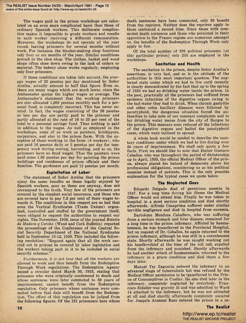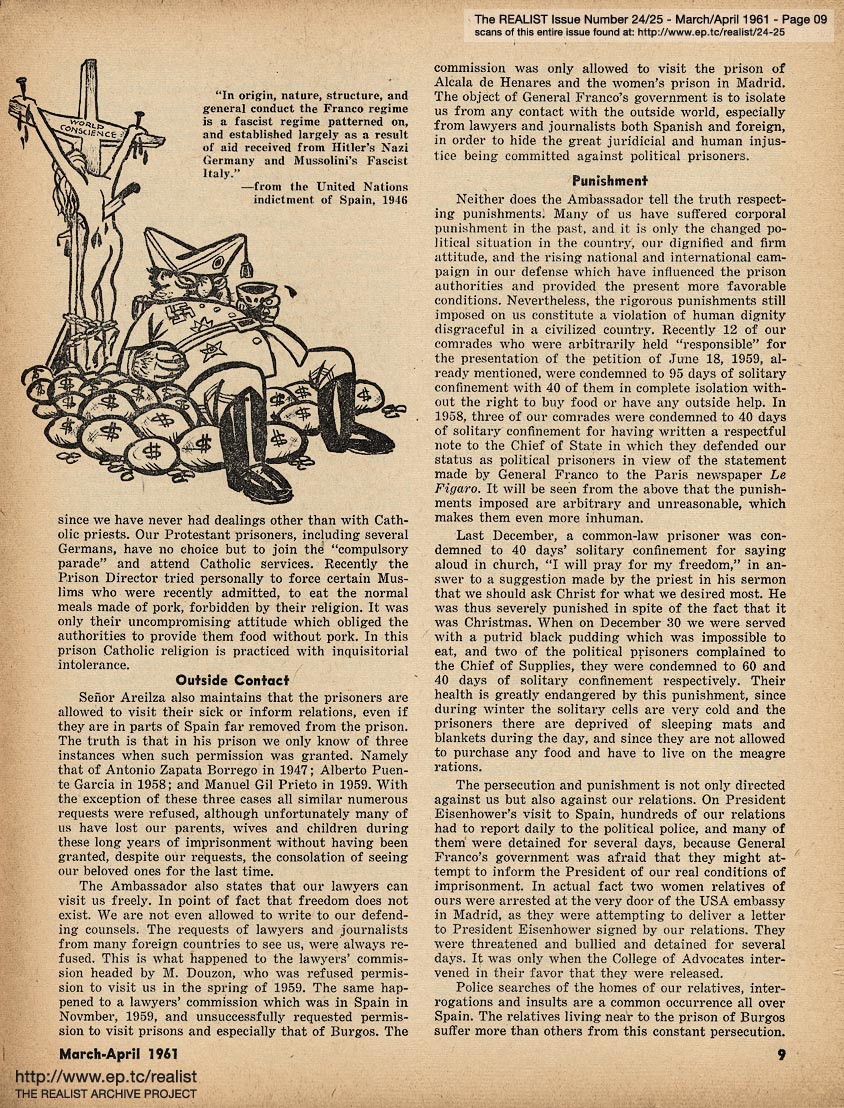 MARCH/APRIL 1961 CONTENTS: Page 01: COLLEGE TEACHER IN MISSISSIPPI by Dave Berkman and POLITICAL PRISONERS IN FRANCO'S SPAIN -- Page 02: SIR REALIST -- Page 03: EDITORIAL TYPE STUFF -- Page 04 -- Page 05 -- Page 06 -- Page 07: FRANCO'S PRISONERS SPEAK (Continued from Cover) -- Page 08 -- Page 09 -- Page 10 -- Page 11: THE CASE OF DAMIAN ECUDER LLADO -- Page 12 -- Page 13: even if you never see another movie, please don't reveal the ending of ... PSYCHITA -- Page 14 -- Page 15: COLLEGE TEACHER IN MISSISSIPPI (Continued from Cover) and RUMORS OF THE MONTH -- Page 16 -- Centerfold Item: "Mary Had a Little Lamb" by Shoemaker -- Page 17 -- Page 18 -- Page 19: OF DOLLS AND DREAMS ... by Bob Margolin -- Page 20: JIMCROW HUMOR -- Page 21: THE LIBIDO OF A CONSERVATIVE by Garry Boldwater (as told to Herbert Swartz) -- Page 22 -- Page 23: DEPARTMENT OF UNINTENTIONAL SATIRE -- Page 24: OUT IN LEFT FIELD WITHOUT A BAT by James Higgins -- Page 25: Excerpt from a TV audience participation program - IT COULD BE YOUR LIFE TO TELL THE TRUTH OR CONSEQUENCES ARE FUNNY -- Page 26: COLUMNY by John Wilcock -- Page 27 -- Page 28: MORE MALICE IN MARYLAND by Madalyn E. Murray -- Page 29: An Editorial Footnote by Paul Krassner -- Page 30: CASE HISTORY OF A POLITICAL HOAX and LENNY BRUCE ON THE GREAT DEBATE -- Page 31: A QUARTERLY REPORT ON SOME OF THE CRAP THAT'S BEEN GOING ON by Bob Abel -- Page 32: QUERY OF THE MONTH