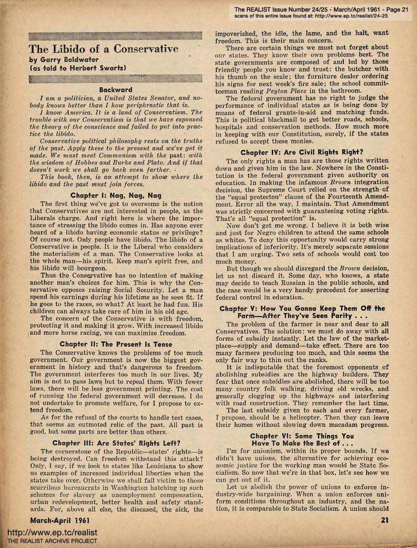 MARCH/APRIL 1961 CONTENTS: Page 01: COLLEGE TEACHER IN MISSISSIPPI by Dave Berkman and POLITICAL PRISONERS IN FRANCO'S SPAIN -- Page 02: SIR REALIST -- Page 03: EDITORIAL TYPE STUFF -- Page 04 -- Page 05 -- Page 06 -- Page 07: FRANCO'S PRISONERS SPEAK (Continued from Cover) -- Page 08 -- Page 09 -- Page 10 -- Page 11: THE CASE OF DAMIAN ECUDER LLADO -- Page 12 -- Page 13: even if you never see another movie, please don't reveal the ending of ... PSYCHITA -- Page 14 -- Page 15: COLLEGE TEACHER IN MISSISSIPPI (Continued from Cover) and RUMORS OF THE MONTH -- Page 16 -- Centerfold Item: "Mary Had a Little Lamb" by Shoemaker -- Page 17 -- Page 18 -- Page 19: OF DOLLS AND DREAMS ... by Bob Margolin -- Page 20: JIMCROW HUMOR -- Page 21: THE LIBIDO OF A CONSERVATIVE by Garry Boldwater (as told to Herbert Swartz) -- Page 22 -- Page 23: DEPARTMENT OF UNINTENTIONAL SATIRE -- Page 24: OUT IN LEFT FIELD WITHOUT A BAT by James Higgins -- Page 25: Excerpt from a TV audience participation program - IT COULD BE YOUR LIFE TO TELL THE TRUTH OR CONSEQUENCES ARE FUNNY -- Page 26: COLUMNY by John Wilcock -- Page 27 -- Page 28: MORE MALICE IN MARYLAND by Madalyn E. Murray -- Page 29: An Editorial Footnote by Paul Krassner -- Page 30: CASE HISTORY OF A POLITICAL HOAX and LENNY BRUCE ON THE GREAT DEBATE -- Page 31: A QUARTERLY REPORT ON SOME OF THE CRAP THAT'S BEEN GOING ON by Bob Abel -- Page 32: QUERY OF THE MONTH