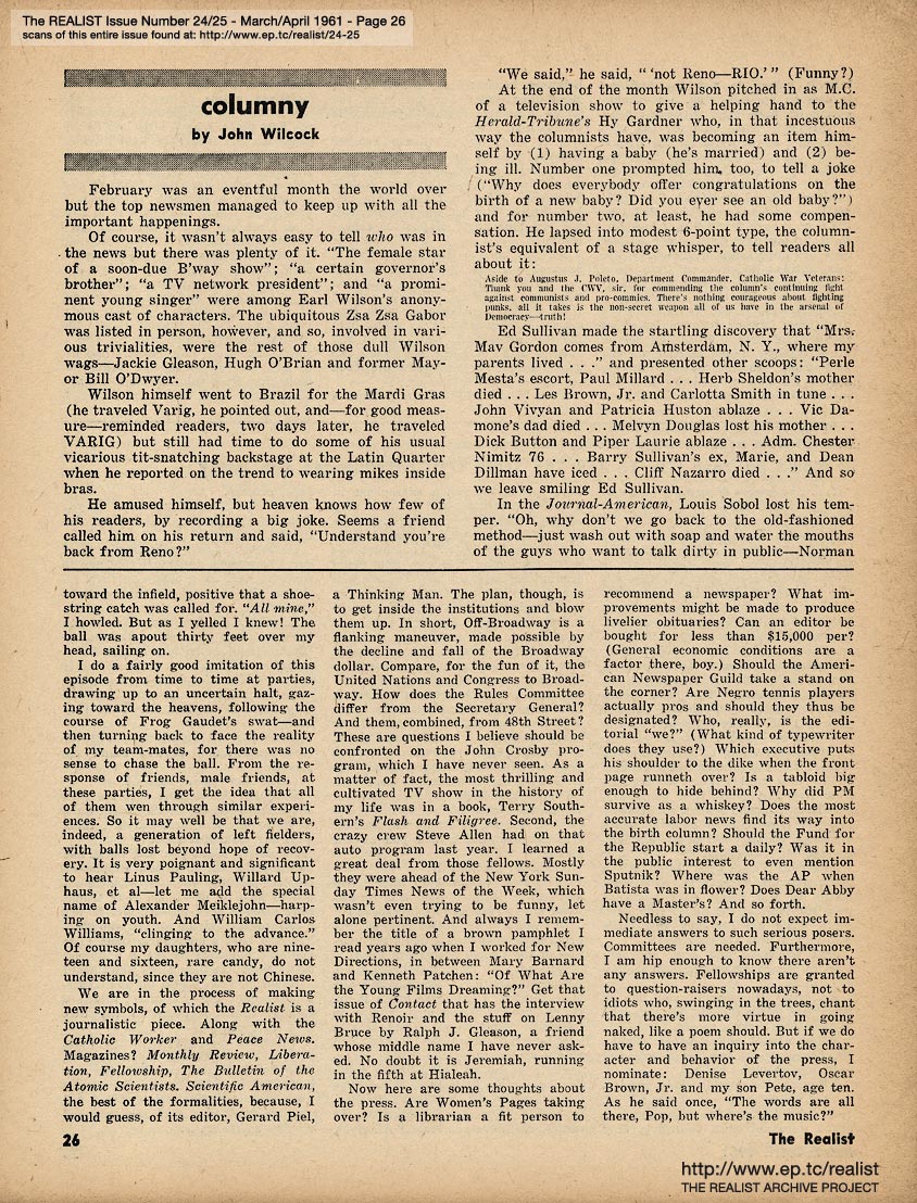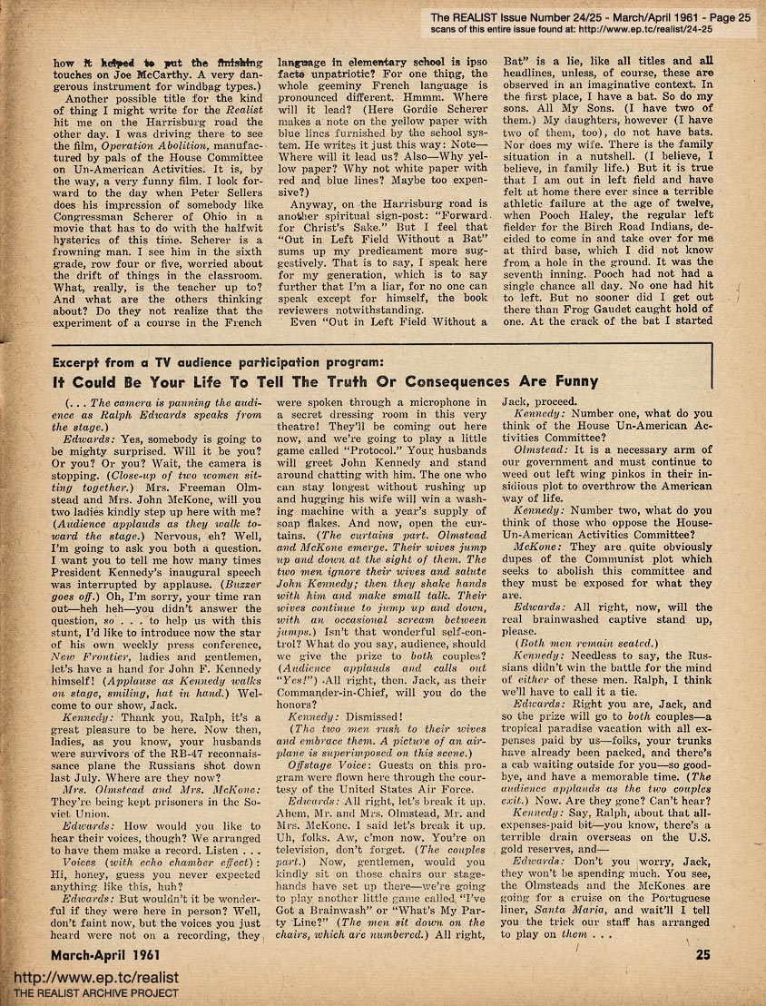 MARCH/APRIL 1961 CONTENTS: Page 01: COLLEGE TEACHER IN MISSISSIPPI by Dave Berkman and POLITICAL PRISONERS IN FRANCO'S SPAIN -- Page 02: SIR REALIST -- Page 03: EDITORIAL TYPE STUFF -- Page 04 -- Page 05 -- Page 06 -- Page 07: FRANCO'S PRISONERS SPEAK (Continued from Cover) -- Page 08 -- Page 09 -- Page 10 -- Page 11: THE CASE OF DAMIAN ECUDER LLADO -- Page 12 -- Page 13: even if you never see another movie, please don't reveal the ending of ... PSYCHITA -- Page 14 -- Page 15: COLLEGE TEACHER IN MISSISSIPPI (Continued from Cover) and RUMORS OF THE MONTH -- Page 16 -- Centerfold Item: "Mary Had a Little Lamb" by Shoemaker -- Page 17 -- Page 18 -- Page 19: OF DOLLS AND DREAMS ... by Bob Margolin -- Page 20: JIMCROW HUMOR -- Page 21: THE LIBIDO OF A CONSERVATIVE by Garry Boldwater (as told to Herbert Swartz) -- Page 22 -- Page 23: DEPARTMENT OF UNINTENTIONAL SATIRE -- Page 24: OUT IN LEFT FIELD WITHOUT A BAT by James Higgins -- Page 25: Excerpt from a TV audience participation program - IT COULD BE YOUR LIFE TO TELL THE TRUTH OR CONSEQUENCES ARE FUNNY -- Page 26: COLUMNY by John Wilcock -- Page 27 -- Page 28: MORE MALICE IN MARYLAND by Madalyn E. Murray -- Page 29: An Editorial Footnote by Paul Krassner -- Page 30: CASE HISTORY OF A POLITICAL HOAX and LENNY BRUCE ON THE GREAT DEBATE -- Page 31: A QUARTERLY REPORT ON SOME OF THE CRAP THAT'S BEEN GOING ON by Bob Abel -- Page 32: QUERY OF THE MONTH