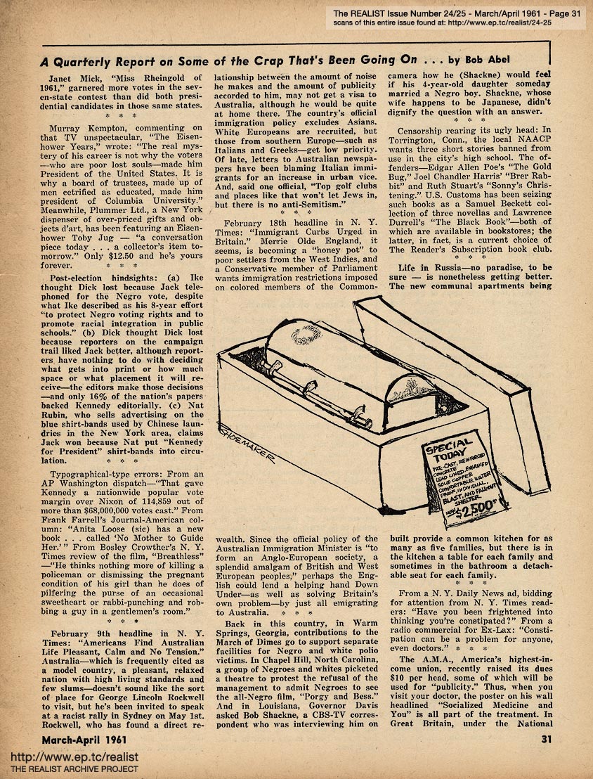 MARCH/APRIL 1961 CONTENTS: Page 01: COLLEGE TEACHER IN MISSISSIPPI by Dave Berkman and POLITICAL PRISONERS IN FRANCO'S SPAIN -- Page 02: SIR REALIST -- Page 03: EDITORIAL TYPE STUFF -- Page 04 -- Page 05 -- Page 06 -- Page 07: FRANCO'S PRISONERS SPEAK (Continued from Cover) -- Page 08 -- Page 09 -- Page 10 -- Page 11: THE CASE OF DAMIAN ECUDER LLADO -- Page 12 -- Page 13: even if you never see another movie, please don't reveal the ending of ... PSYCHITA -- Page 14 -- Page 15: COLLEGE TEACHER IN MISSISSIPPI (Continued from Cover) and RUMORS OF THE MONTH -- Page 16 -- Centerfold Item: "Mary Had a Little Lamb" by Shoemaker -- Page 17 -- Page 18 -- Page 19: OF DOLLS AND DREAMS ... by Bob Margolin -- Page 20: JIMCROW HUMOR -- Page 21: THE LIBIDO OF A CONSERVATIVE by Garry Boldwater (as told to Herbert Swartz) -- Page 22 -- Page 23: DEPARTMENT OF UNINTENTIONAL SATIRE -- Page 24: OUT IN LEFT FIELD WITHOUT A BAT by James Higgins -- Page 25: Excerpt from a TV audience participation program - IT COULD BE YOUR LIFE TO TELL THE TRUTH OR CONSEQUENCES ARE FUNNY -- Page 26: COLUMNY by John Wilcock -- Page 27 -- Page 28: MORE MALICE IN MARYLAND by Madalyn E. Murray -- Page 29: An Editorial Footnote by Paul Krassner -- Page 30: CASE HISTORY OF A POLITICAL HOAX and LENNY BRUCE ON THE GREAT DEBATE -- Page 31: A QUARTERLY REPORT ON SOME OF THE CRAP THAT'S BEEN GOING ON by Bob Abel -- Page 32: QUERY OF THE MONTH