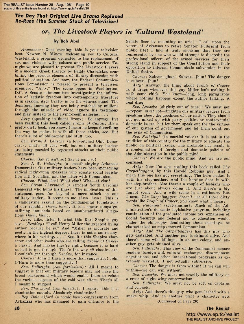 AUGUST 1961 CONTENTS: Page 01: CLOSE COVER BEFORE STRIKING - I Was a Teenaged Senior Citizen - Playtex Living Bra Dies of Malnutrition - and - Does Space Actually Have a Finite End? -- Page 02: SIR REALIST (letters) -- Page 03: EDITORIAL TYPE STUFF - Sorry, Right Number (a tale of two phone calls) -- Page 04: The Naked Emperor (Continued) and Excerpts from 'Food Stockpiling for Emergency Shelters' -- Page 05: Morality On The Meat-Block, 'Next Week: East (Ber)Lynne' and WHAT'S THE CATCH by Marshall E. Deutsch -- Page 06: Would You Believe It --- I HAVE A CULT ... -- Page 07: CORE AND SURFACE by Lawrence Barth -- Page 08 -- Page 09: RUMOR OF THE MONTH, NEO-GENESIS by Steve Pittel, and ONE POTATO, TWO POTATO, THREE POTATO, FOUR ... -- Page 10: THE DAY THAT ORIGINAL LIVE DRAMA REPLACED RE-RUNS (THE SUMMER STOCK OF TELEVISION) OR, THE LIVESTOCK PLAYERS IN 'CULTURAL WASTELAND' by Bob Abel -- Page 11: TRIAL BY PREJUDICE by William Worthy - and DIABOLIC DIALOGUES: CASTRO AND THE STEVENSON CONVERTIBLE -- Page 12 -- Page 13 -- Page 14 -- Page 15: THE SAVAGE SOUND by James Higgins -- Page 16 -- Page 17: AN IMPOLITE INTERVIEW WITH SHEL SILVERSTEIN -- Page 18 -- Page 19 -- Page 20: MODEST PROPOSALS by John Francis Putnam (The Ten Most Over-Rated Men In America Today) -- Page 21: THE AMERICAN UNDERGROUND by John Wilcock -- Page 22: SILENCE MAY BE GOLDEN ... BUT HARRY'S OFF THE STANDARD -- Page 23 -- Back Cover: THE REALIST'S SOCIETY PAGE by Eileen Brand