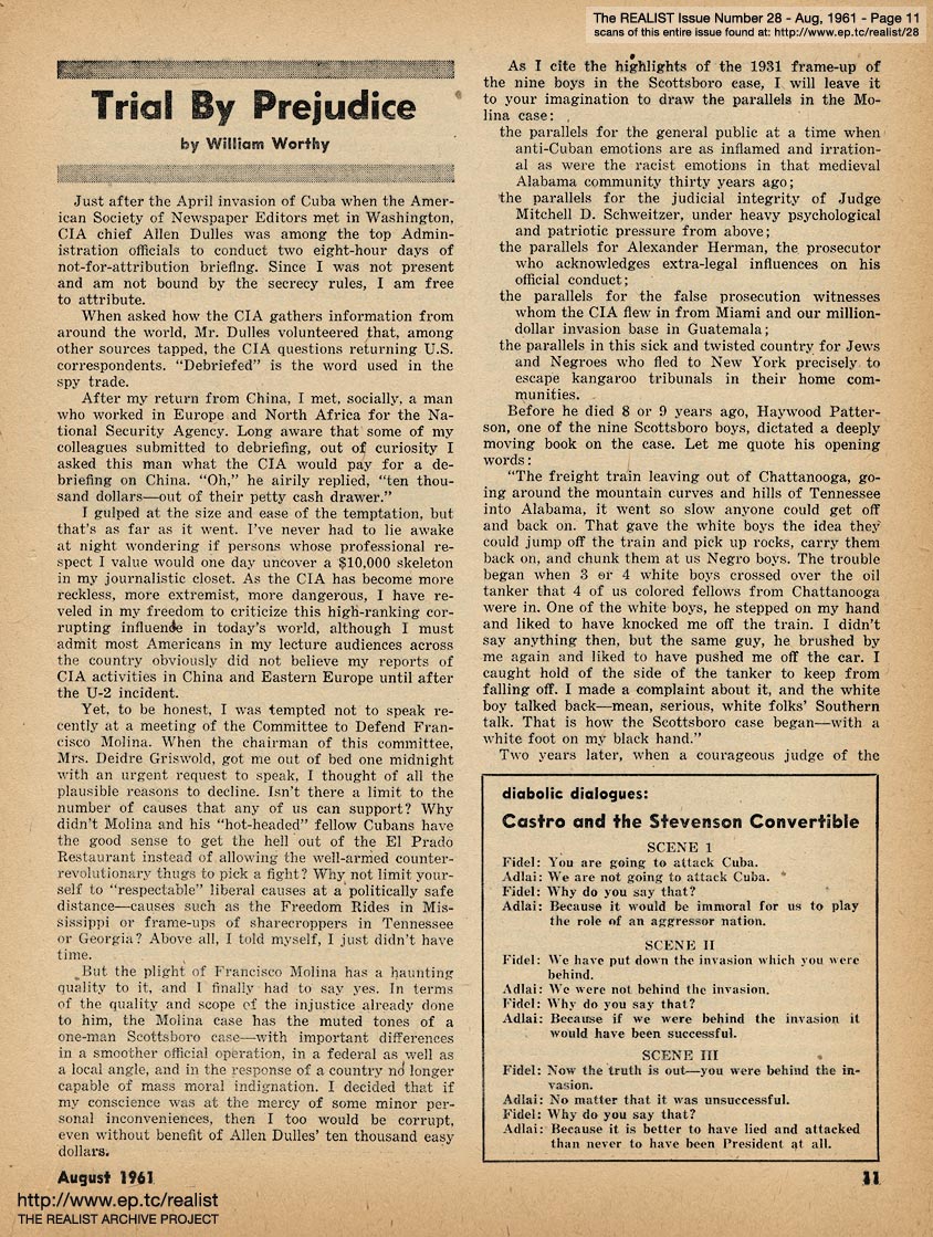 AUGUST 1961 CONTENTS: Page 01: CLOSE COVER BEFORE STRIKING - I Was a Teenaged Senior Citizen - Playtex Living Bra Dies of Malnutrition - and - Does Space Actually Have a Finite End? -- Page 02: SIR REALIST (letters) -- Page 03: EDITORIAL TYPE STUFF - Sorry, Right Number (a tale of two phone calls) -- Page 04: The Naked Emperor (Continued) and Excerpts from 'Food Stockpiling for Emergency Shelters' -- Page 05: Morality On The Meat-Block, 'Next Week: East (Ber)Lynne' and WHAT'S THE CATCH by Marshall E. Deutsch -- Page 06: Would You Believe It --- I HAVE A CULT ... -- Page 07: CORE AND SURFACE by Lawrence Barth -- Page 08 -- Page 09: RUMOR OF THE MONTH, NEO-GENESIS by Steve Pittel, and ONE POTATO, TWO POTATO, THREE POTATO, FOUR ... -- Page 10: THE DAY THAT ORIGINAL LIVE DRAMA REPLACED RE-RUNS (THE SUMMER STOCK OF TELEVISION) OR, THE LIVESTOCK PLAYERS IN 'CULTURAL WASTELAND' by Bob Abel -- Page 11: TRIAL BY PREJUDICE by William Worthy - and DIABOLIC DIALOGUES: CASTRO AND THE STEVENSON CONVERTIBLE -- Page 12 -- Page 13 -- Page 14 -- Page 15: THE SAVAGE SOUND by James Higgins -- Page 16 -- Page 17: AN IMPOLITE INTERVIEW WITH SHEL SILVERSTEIN -- Page 18 -- Page 19 -- Page 20: MODEST PROPOSALS by John Francis Putnam (The Ten Most Over-Rated Men In America Today) -- Page 21: THE AMERICAN UNDERGROUND by John Wilcock -- Page 22: SILENCE MAY BE GOLDEN ... BUT HARRY'S OFF THE STANDARD -- Page 23 -- Back Cover: THE REALIST'S SOCIETY PAGE by Eileen Brand