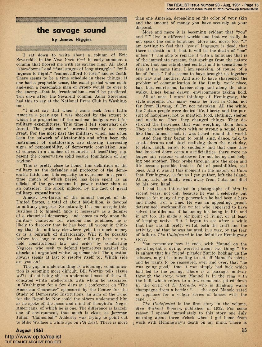 AUGUST 1961 CONTENTS: Page 01: CLOSE COVER BEFORE STRIKING - I Was a Teenaged Senior Citizen - Playtex Living Bra Dies of Malnutrition - and - Does Space Actually Have a Finite End? -- Page 02: SIR REALIST (letters) -- Page 03: EDITORIAL TYPE STUFF - Sorry, Right Number (a tale of two phone calls) -- Page 04: The Naked Emperor (Continued) and Excerpts from 'Food Stockpiling for Emergency Shelters' -- Page 05: Morality On The Meat-Block, 'Next Week: East (Ber)Lynne' and WHAT'S THE CATCH by Marshall E. Deutsch -- Page 06: Would You Believe It --- I HAVE A CULT ... -- Page 07: CORE AND SURFACE by Lawrence Barth -- Page 08 -- Page 09: RUMOR OF THE MONTH, NEO-GENESIS by Steve Pittel, and ONE POTATO, TWO POTATO, THREE POTATO, FOUR ... -- Page 10: THE DAY THAT ORIGINAL LIVE DRAMA REPLACED RE-RUNS (THE SUMMER STOCK OF TELEVISION) OR, THE LIVESTOCK PLAYERS IN 'CULTURAL WASTELAND' by Bob Abel -- Page 11: TRIAL BY PREJUDICE by William Worthy - and DIABOLIC DIALOGUES: CASTRO AND THE STEVENSON CONVERTIBLE -- Page 12 -- Page 13 -- Page 14 -- Page 15: THE SAVAGE SOUND by James Higgins -- Page 16 -- Page 17: AN IMPOLITE INTERVIEW WITH SHEL SILVERSTEIN -- Page 18 -- Page 19 -- Page 20: MODEST PROPOSALS by John Francis Putnam (The Ten Most Over-Rated Men In America Today) -- Page 21: THE AMERICAN UNDERGROUND by John Wilcock -- Page 22: SILENCE MAY BE GOLDEN ... BUT HARRY'S OFF THE STANDARD -- Page 23 -- Back Cover: THE REALIST'S SOCIETY PAGE by Eileen Brand