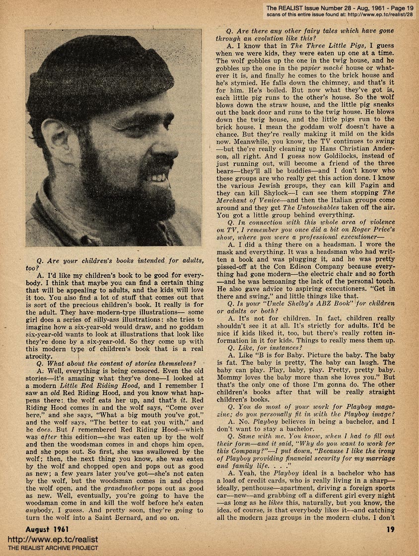 AUGUST 1961 CONTENTS: Page 01: CLOSE COVER BEFORE STRIKING - I Was a Teenaged Senior Citizen - Playtex Living Bra Dies of Malnutrition - and - Does Space Actually Have a Finite End? -- Page 02: SIR REALIST (letters) -- Page 03: EDITORIAL TYPE STUFF - Sorry, Right Number (a tale of two phone calls) -- Page 04: The Naked Emperor (Continued) and Excerpts from 'Food Stockpiling for Emergency Shelters' -- Page 05: Morality On The Meat-Block, 'Next Week: East (Ber)Lynne' and WHAT'S THE CATCH by Marshall E. Deutsch -- Page 06: Would You Believe It --- I HAVE A CULT ... -- Page 07: CORE AND SURFACE by Lawrence Barth -- Page 08 -- Page 09: RUMOR OF THE MONTH, NEO-GENESIS by Steve Pittel, and ONE POTATO, TWO POTATO, THREE POTATO, FOUR ... -- Page 10: THE DAY THAT ORIGINAL LIVE DRAMA REPLACED RE-RUNS (THE SUMMER STOCK OF TELEVISION) OR, THE LIVESTOCK PLAYERS IN 'CULTURAL WASTELAND' by Bob Abel -- Page 11: TRIAL BY PREJUDICE by William Worthy - and DIABOLIC DIALOGUES: CASTRO AND THE STEVENSON CONVERTIBLE -- Page 12 -- Page 13 -- Page 14 -- Page 15: THE SAVAGE SOUND by James Higgins -- Page 16 -- Page 17: AN IMPOLITE INTERVIEW WITH SHEL SILVERSTEIN -- Page 18 -- Page 19 -- Page 20: MODEST PROPOSALS by John Francis Putnam (The Ten Most Over-Rated Men In America Today) -- Page 21: THE AMERICAN UNDERGROUND by John Wilcock -- Page 22: SILENCE MAY BE GOLDEN ... BUT HARRY'S OFF THE STANDARD -- Page 23 -- Back Cover: THE REALIST'S SOCIETY PAGE by Eileen Brand
