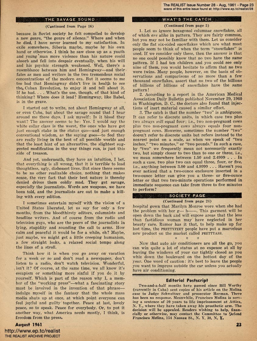 AUGUST 1961 CONTENTS: Page 01: CLOSE COVER BEFORE STRIKING - I Was a Teenaged Senior Citizen - Playtex Living Bra Dies of Malnutrition - and - Does Space Actually Have a Finite End? -- Page 02: SIR REALIST (letters) -- Page 03: EDITORIAL TYPE STUFF - Sorry, Right Number (a tale of two phone calls) -- Page 04: The Naked Emperor (Continued) and Excerpts from 'Food Stockpiling for Emergency Shelters' -- Page 05: Morality On The Meat-Block, 'Next Week: East (Ber)Lynne' and WHAT'S THE CATCH by Marshall E. Deutsch -- Page 06: Would You Believe It --- I HAVE A CULT ... -- Page 07: CORE AND SURFACE by Lawrence Barth -- Page 08 -- Page 09: RUMOR OF THE MONTH, NEO-GENESIS by Steve Pittel, and ONE POTATO, TWO POTATO, THREE POTATO, FOUR ... -- Page 10: THE DAY THAT ORIGINAL LIVE DRAMA REPLACED RE-RUNS (THE SUMMER STOCK OF TELEVISION) OR, THE LIVESTOCK PLAYERS IN 'CULTURAL WASTELAND' by Bob Abel -- Page 11: TRIAL BY PREJUDICE by William Worthy - and DIABOLIC DIALOGUES: CASTRO AND THE STEVENSON CONVERTIBLE -- Page 12 -- Page 13 -- Page 14 -- Page 15: THE SAVAGE SOUND by James Higgins -- Page 16 -- Page 17: AN IMPOLITE INTERVIEW WITH SHEL SILVERSTEIN -- Page 18 -- Page 19 -- Page 20: MODEST PROPOSALS by John Francis Putnam (The Ten Most Over-Rated Men In America Today) -- Page 21: THE AMERICAN UNDERGROUND by John Wilcock -- Page 22: SILENCE MAY BE GOLDEN ... BUT HARRY'S OFF THE STANDARD -- Page 23 -- Back Cover: THE REALIST'S SOCIETY PAGE by Eileen Brand
