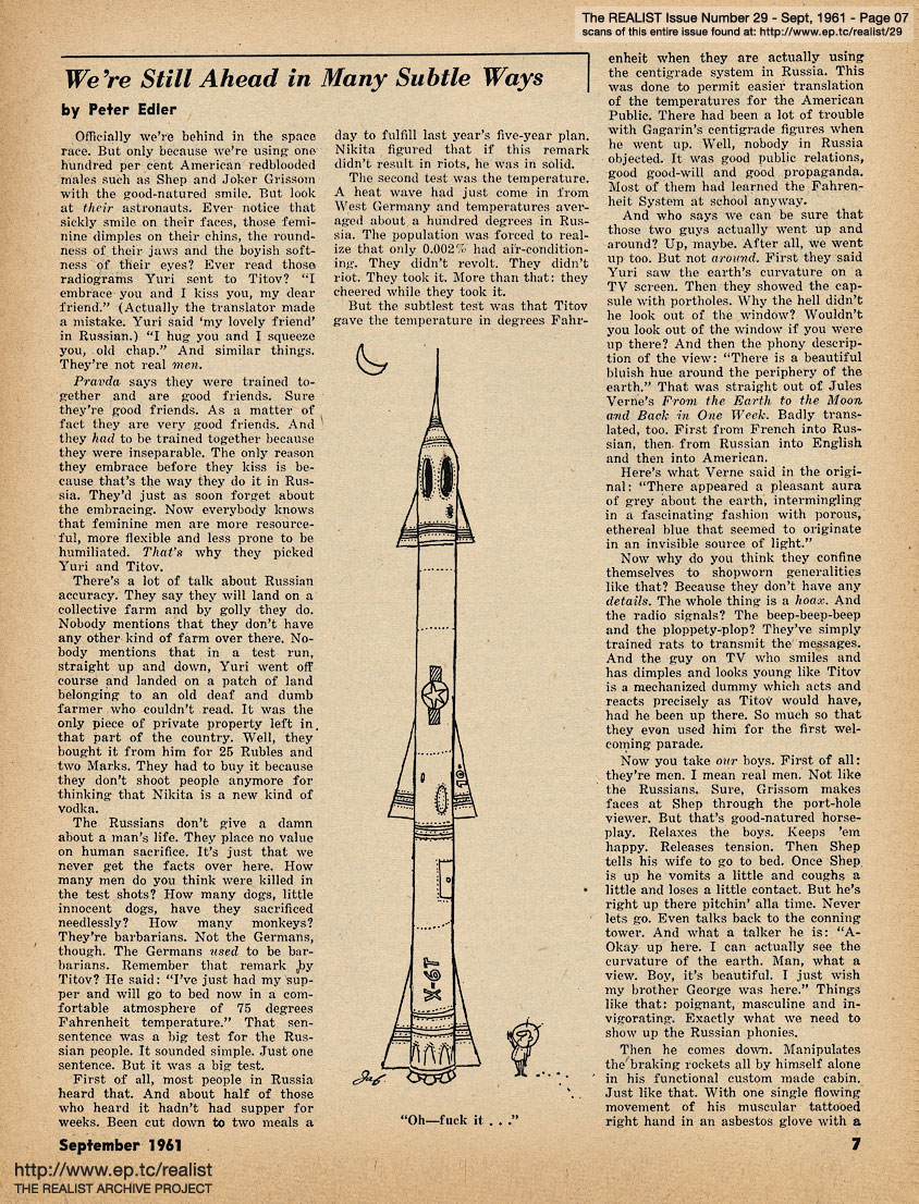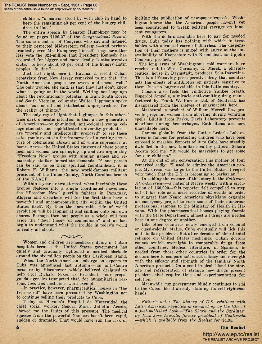 SEPTEMBER 1961 CONTENTS: Page 01: THE BOMB SHELTER KEY CLUB PLAN by Sally Baldwin and AN IMPOLITE INTERVIEW WITH DICK GREGORY -- Page 02: BUT DEAD MEN DON'T REVOLT and A WORD TO THE PSYCHIC IS UNNECESSARY -- Page 03: EDITORIAL TYPE STUFF - The Cause and Cure of the Realist -- Page 04: The Plug at the End of the Page -- Page 05: LATIN AMERICAN REPORT by Wiliam Worthy -- Page 06 -- Page 07 -- Page 08: HOW TO WALK ON WATER by George von Hillsheimer -- Page 09 -- Page 10: NEGATIVE THINKING by Robert Anton Wilson -- Page 11: Communist Propaganda of the Month and EPITHALAMIUM FOR TWO HERMAPHRODITES by Ed Murray -- Page 12 -- Page 13 -- Page 14: Vocational Rehabilitation of the Month -- Page 15: REPORT FROM AN INDEPENDENT RESEARCH LABORATORY by Marvin Kitman and WHO PUT THE MEN IN MENTHOL SMOKING? -- Page 16: The Most Hollow Clause of All and Rumors of the Month -- Page 17: BOB ABEL'S THIRD QUARTERLY REPORT ON SOME OF THE CRAP IN ORBIT -- Page 18 -- Page 19 -- Page 20 -- Page 21 -- Page 22 -- Page 23 -- Back Cover: SEX AND THE COLD WAR: THREE VIEWS (or—Lucky Paul, He's In The Middle) by Eileen Brand, Paul Krassner and Howard Shoemaker