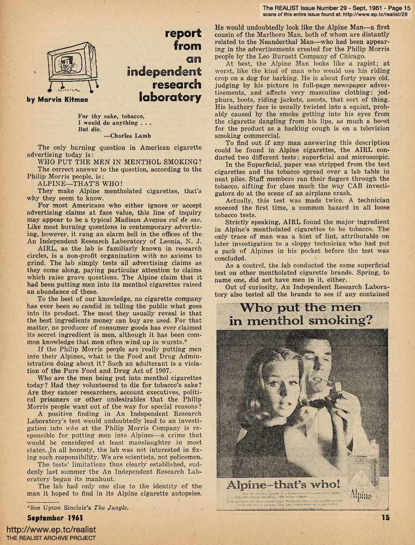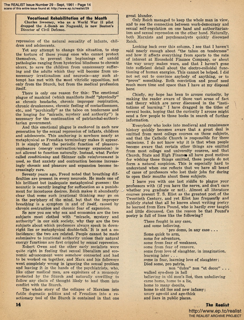 SEPTEMBER 1961 CONTENTS: Page 01: THE BOMB SHELTER KEY CLUB PLAN by Sally Baldwin and AN IMPOLITE INTERVIEW WITH DICK GREGORY -- Page 02: BUT DEAD MEN DON'T REVOLT and A WORD TO THE PSYCHIC IS UNNECESSARY -- Page 03: EDITORIAL TYPE STUFF - The Cause and Cure of the Realist -- Page 04: The Plug at the End of the Page -- Page 05: LATIN AMERICAN REPORT by Wiliam Worthy -- Page 06 -- Page 07 -- Page 08: HOW TO WALK ON WATER by George von Hillsheimer -- Page 09 -- Page 10: NEGATIVE THINKING by Robert Anton Wilson -- Page 11: Communist Propaganda of the Month and EPITHALAMIUM FOR TWO HERMAPHRODITES by Ed Murray -- Page 12 -- Page 13 -- Page 14: Vocational Rehabilitation of the Month -- Page 15: REPORT FROM AN INDEPENDENT RESEARCH LABORATORY by Marvin Kitman and WHO PUT THE MEN IN MENTHOL SMOKING? -- Page 16: The Most Hollow Clause of All and Rumors of the Month -- Page 17: BOB ABEL'S THIRD QUARTERLY REPORT ON SOME OF THE CRAP IN ORBIT -- Page 18 -- Page 19 -- Page 20 -- Page 21 -- Page 22 -- Page 23 -- Back Cover: SEX AND THE COLD WAR: THREE VIEWS (or—Lucky Paul, He's In The Middle) by Eileen Brand, Paul Krassner and Howard Shoemaker