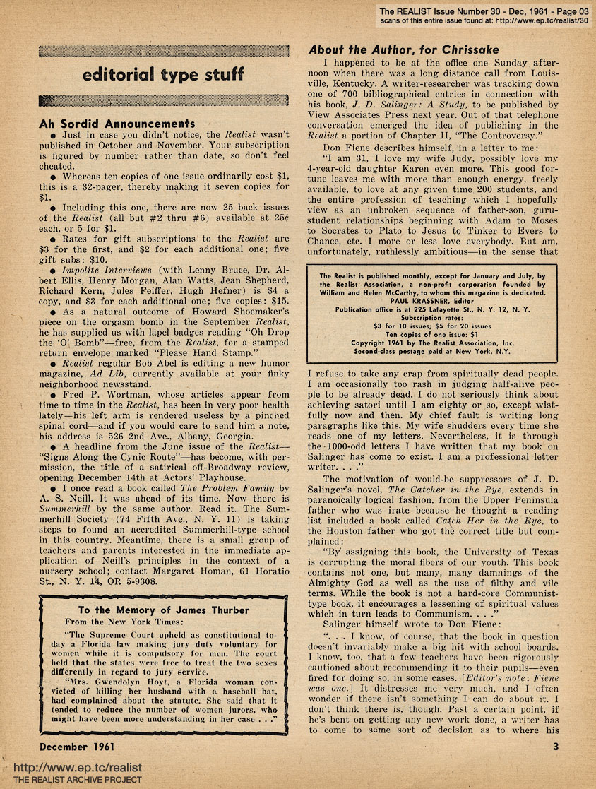 DECEMBER 1961 CONTENTS: Page 01: FROM A STUDY OF SALINGER: CONTROVERSY IN THE CATCHER by Donald M. Fiene and HOW I FORTIFIED MY FAMILY FALLOUT SHELTER by Marvin Kitman -- Page 02: THE MUSICAL COMEDY - A VOICE OF AMERICA? by Alan Casty -- Page 03: EDITORIAL TYPE STUFF - Ah Sordid Announcements - About the Author, for Chrissake - To the Memory of James Thurber -- Page 04: With Equal Time for All - No, Virginia, There Isn't a Sanity Clause -- Page 05: The Final Strains of Human Dignity - Department of Satirical Prophecy - Funny You Should Ask That - Realist-of-the-Year Award - Action, Si ... Label, No -- Page 06: The Good-Bad Guy - General Strike vs. Private Concern - Two Facts and a Rumor - The Lawsuit Bit - A Star Is Aborted -- Page 07: THE UNFABULOUS CIVIL WAR by Hiag Akmakjian and THE DAY EISENHOWER LIVED ... -- Page 08 -- Page 09 -- Page 10: GAMES FOR EXISTENTIALIST KIDS by Martin Berman -- Page 11 -- Page 12 -- Page 13: NEGATIVE THINKING by Robert Anton Wilson, Letter to a Man in Washington and OF GUARDS AND GUTS -- Page 14: LETTER FROM A SOLDIER'S WIFE by Lenny Bruce and THE DAILY LIE by James Higgins -- Page 15 -- Page 16 -- Page 17: UNDER THE COUNTER INTELLIGENCE by Jack Magarrell -- Page 18: THE POWER OF KINKY THINKING by Justin Smith -- Page 19: STOPOVER IN MIAMI by William Worthy -- Page 20: THE REALIST'S SOCIETY PAGE by Eileen Brand and EAST OF THE SOUTH by Dave Berkman -- Page 21 -- Page 22 -- Page 23 -- Page 24 -- Page 25 -- Page 26: MUSIC TO PHANTASIZE BY and I'VE GOT THE AUTHENTIC IDENTITY BLUES by Sylvia Dees -- Page 27: HOW TO WALK ON WATER by George von Hilsheimer -- Page 28: DEPARTMENT OF HMMMMM... -- Page 29: Cartoon, "J.C." by Ken Seagel and bhob stewart -- Page 30: THE KOOK'S TOUR OF THE JOYOUS DAYS by Mort Gerberg -- Page 31: THE 1961 EPISTLE PRIZES by Bob Abel and REQUIEM FOR A HEAD-HUNTER -- Back Cover: MODEST PROPOSALS by John Francis Putnam, New Wive's Tales for Old and NIGHTMARE ADLAI (Stevenson) by Jerry DeMuth
