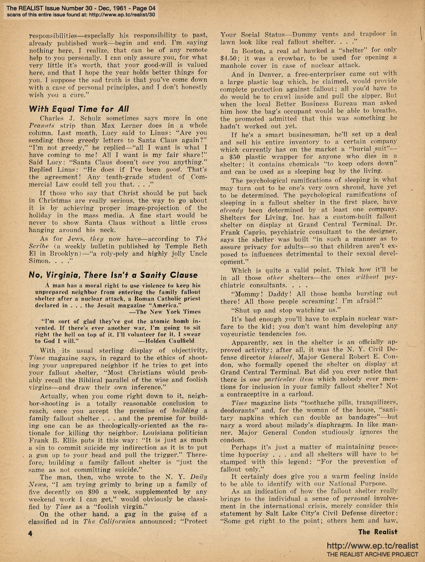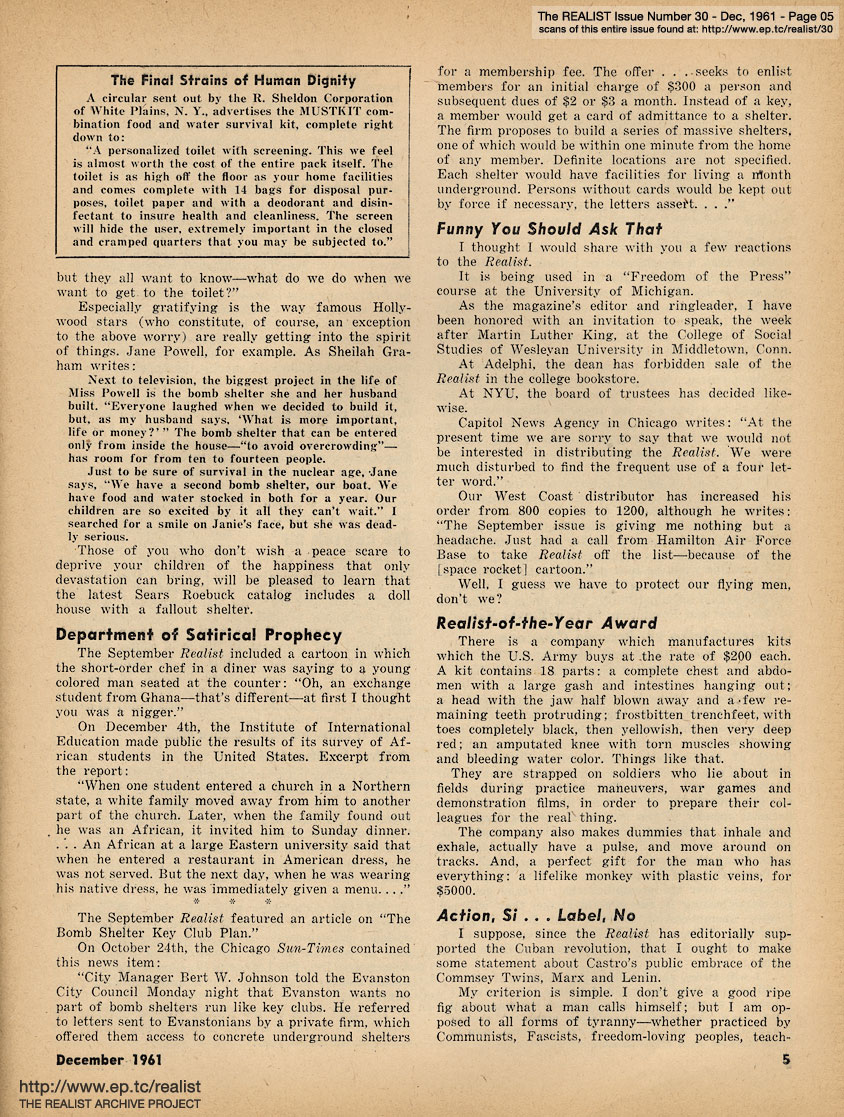 DECEMBER 1961 CONTENTS: Page 01: FROM A STUDY OF SALINGER: CONTROVERSY IN THE CATCHER by Donald M. Fiene and HOW I FORTIFIED MY FAMILY FALLOUT SHELTER by Marvin Kitman -- Page 02: THE MUSICAL COMEDY - A VOICE OF AMERICA? by Alan Casty -- Page 03: EDITORIAL TYPE STUFF - Ah Sordid Announcements - About the Author, for Chrissake - To the Memory of James Thurber -- Page 04: With Equal Time for All - No, Virginia, There Isn't a Sanity Clause -- Page 05: The Final Strains of Human Dignity - Department of Satirical Prophecy - Funny You Should Ask That - Realist-of-the-Year Award - Action, Si ... Label, No -- Page 06: The Good-Bad Guy - General Strike vs. Private Concern - Two Facts and a Rumor - The Lawsuit Bit - A Star Is Aborted -- Page 07: THE UNFABULOUS CIVIL WAR by Hiag Akmakjian and THE DAY EISENHOWER LIVED ... -- Page 08 -- Page 09 -- Page 10: GAMES FOR EXISTENTIALIST KIDS by Martin Berman -- Page 11 -- Page 12 -- Page 13: NEGATIVE THINKING by Robert Anton Wilson, Letter to a Man in Washington and OF GUARDS AND GUTS -- Page 14: LETTER FROM A SOLDIER'S WIFE by Lenny Bruce and THE DAILY LIE by James Higgins -- Page 15 -- Page 16 -- Page 17: UNDER THE COUNTER INTELLIGENCE by Jack Magarrell -- Page 18: THE POWER OF KINKY THINKING by Justin Smith -- Page 19: STOPOVER IN MIAMI by William Worthy -- Page 20: THE REALIST'S SOCIETY PAGE by Eileen Brand and EAST OF THE SOUTH by Dave Berkman -- Page 21 -- Page 22 -- Page 23 -- Page 24 -- Page 25 -- Page 26: MUSIC TO PHANTASIZE BY and I'VE GOT THE AUTHENTIC IDENTITY BLUES by Sylvia Dees -- Page 27: HOW TO WALK ON WATER by George von Hilsheimer -- Page 28: DEPARTMENT OF HMMMMM... -- Page 29: Cartoon, "J.C." by Ken Seagel and bhob stewart -- Page 30: THE KOOK'S TOUR OF THE JOYOUS DAYS by Mort Gerberg -- Page 31: THE 1961 EPISTLE PRIZES by Bob Abel and REQUIEM FOR A HEAD-HUNTER -- Back Cover: MODEST PROPOSALS by John Francis Putnam, New Wive's Tales for Old and NIGHTMARE ADLAI (Stevenson) by Jerry DeMuth