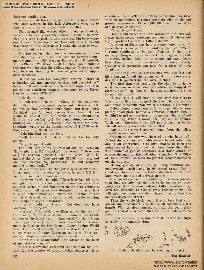 DECEMBER 1961 CONTENTS: Page 01: FROM A STUDY OF SALINGER: CONTROVERSY IN THE CATCHER by Donald M. Fiene and HOW I FORTIFIED MY FAMILY FALLOUT SHELTER by Marvin Kitman -- Page 02: THE MUSICAL COMEDY - A VOICE OF AMERICA? by Alan Casty -- Page 03: EDITORIAL TYPE STUFF - Ah Sordid Announcements - About the Author, for Chrissake - To the Memory of James Thurber -- Page 04: With Equal Time for All - No, Virginia, There Isn't a Sanity Clause -- Page 05: The Final Strains of Human Dignity - Department of Satirical Prophecy - Funny You Should Ask That - Realist-of-the-Year Award - Action, Si ... Label, No -- Page 06: The Good-Bad Guy - General Strike vs. Private Concern - Two Facts and a Rumor - The Lawsuit Bit - A Star Is Aborted -- Page 07: THE UNFABULOUS CIVIL WAR by Hiag Akmakjian and THE DAY EISENHOWER LIVED ... -- Page 08 -- Page 09 -- Page 10: GAMES FOR EXISTENTIALIST KIDS by Martin Berman -- Page 11 -- Page 12 -- Page 13: NEGATIVE THINKING by Robert Anton Wilson, Letter to a Man in Washington and OF GUARDS AND GUTS -- Page 14: LETTER FROM A SOLDIER'S WIFE by Lenny Bruce and THE DAILY LIE by James Higgins -- Page 15 -- Page 16 -- Page 17: UNDER THE COUNTER INTELLIGENCE by Jack Magarrell -- Page 18: THE POWER OF KINKY THINKING by Justin Smith -- Page 19: STOPOVER IN MIAMI by William Worthy -- Page 20: THE REALIST'S SOCIETY PAGE by Eileen Brand and EAST OF THE SOUTH by Dave Berkman -- Page 21 -- Page 22 -- Page 23 -- Page 24 -- Page 25 -- Page 26: MUSIC TO PHANTASIZE BY and I'VE GOT THE AUTHENTIC IDENTITY BLUES by Sylvia Dees -- Page 27: HOW TO WALK ON WATER by George von Hilsheimer -- Page 28: DEPARTMENT OF HMMMMM... -- Page 29: Cartoon, "J.C." by Ken Seagel and bhob stewart -- Page 30: THE KOOK'S TOUR OF THE JOYOUS DAYS by Mort Gerberg -- Page 31: THE 1961 EPISTLE PRIZES by Bob Abel and REQUIEM FOR A HEAD-HUNTER -- Back Cover: MODEST PROPOSALS by John Francis Putnam, New Wive's Tales for Old and NIGHTMARE ADLAI (Stevenson) by Jerry DeMuth