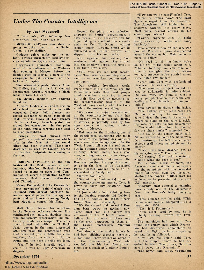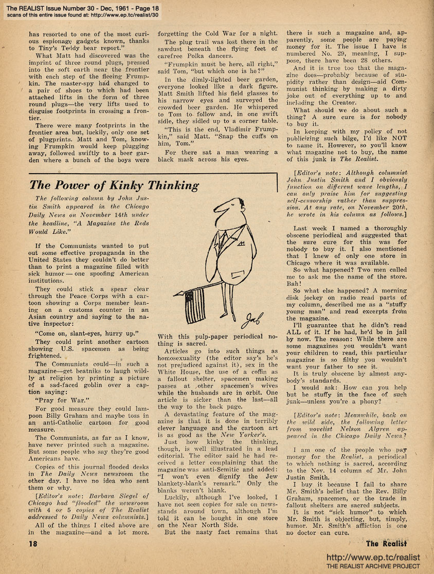 DECEMBER 1961 CONTENTS: Page 01: FROM A STUDY OF SALINGER: CONTROVERSY IN THE CATCHER by Donald M. Fiene and HOW I FORTIFIED MY FAMILY FALLOUT SHELTER by Marvin Kitman -- Page 02: THE MUSICAL COMEDY - A VOICE OF AMERICA? by Alan Casty -- Page 03: EDITORIAL TYPE STUFF - Ah Sordid Announcements - About the Author, for Chrissake - To the Memory of James Thurber -- Page 04: With Equal Time for All - No, Virginia, There Isn't a Sanity Clause -- Page 05: The Final Strains of Human Dignity - Department of Satirical Prophecy - Funny You Should Ask That - Realist-of-the-Year Award - Action, Si ... Label, No -- Page 06: The Good-Bad Guy - General Strike vs. Private Concern - Two Facts and a Rumor - The Lawsuit Bit - A Star Is Aborted -- Page 07: THE UNFABULOUS CIVIL WAR by Hiag Akmakjian and THE DAY EISENHOWER LIVED ... -- Page 08 -- Page 09 -- Page 10: GAMES FOR EXISTENTIALIST KIDS by Martin Berman -- Page 11 -- Page 12 -- Page 13: NEGATIVE THINKING by Robert Anton Wilson, Letter to a Man in Washington and OF GUARDS AND GUTS -- Page 14: LETTER FROM A SOLDIER'S WIFE by Lenny Bruce and THE DAILY LIE by James Higgins -- Page 15 -- Page 16 -- Page 17: UNDER THE COUNTER INTELLIGENCE by Jack Magarrell -- Page 18: THE POWER OF KINKY THINKING by Justin Smith -- Page 19: STOPOVER IN MIAMI by William Worthy -- Page 20: THE REALIST'S SOCIETY PAGE by Eileen Brand and EAST OF THE SOUTH by Dave Berkman -- Page 21 -- Page 22 -- Page 23 -- Page 24 -- Page 25 -- Page 26: MUSIC TO PHANTASIZE BY and I'VE GOT THE AUTHENTIC IDENTITY BLUES by Sylvia Dees -- Page 27: HOW TO WALK ON WATER by George von Hilsheimer -- Page 28: DEPARTMENT OF HMMMMM... -- Page 29: Cartoon, "J.C." by Ken Seagel and bhob stewart -- Page 30: THE KOOK'S TOUR OF THE JOYOUS DAYS by Mort Gerberg -- Page 31: THE 1961 EPISTLE PRIZES by Bob Abel and REQUIEM FOR A HEAD-HUNTER -- Back Cover: MODEST PROPOSALS by John Francis Putnam, New Wive's Tales for Old and NIGHTMARE ADLAI (Stevenson) by Jerry DeMuth