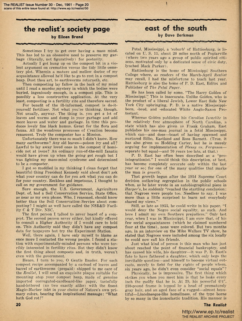 DECEMBER 1961 CONTENTS: Page 01: FROM A STUDY OF SALINGER: CONTROVERSY IN THE CATCHER by Donald M. Fiene and HOW I FORTIFIED MY FAMILY FALLOUT SHELTER by Marvin Kitman -- Page 02: THE MUSICAL COMEDY - A VOICE OF AMERICA? by Alan Casty -- Page 03: EDITORIAL TYPE STUFF - Ah Sordid Announcements - About the Author, for Chrissake - To the Memory of James Thurber -- Page 04: With Equal Time for All - No, Virginia, There Isn't a Sanity Clause -- Page 05: The Final Strains of Human Dignity - Department of Satirical Prophecy - Funny You Should Ask That - Realist-of-the-Year Award - Action, Si ... Label, No -- Page 06: The Good-Bad Guy - General Strike vs. Private Concern - Two Facts and a Rumor - The Lawsuit Bit - A Star Is Aborted -- Page 07: THE UNFABULOUS CIVIL WAR by Hiag Akmakjian and THE DAY EISENHOWER LIVED ... -- Page 08 -- Page 09 -- Page 10: GAMES FOR EXISTENTIALIST KIDS by Martin Berman -- Page 11 -- Page 12 -- Page 13: NEGATIVE THINKING by Robert Anton Wilson, Letter to a Man in Washington and OF GUARDS AND GUTS -- Page 14: LETTER FROM A SOLDIER'S WIFE by Lenny Bruce and THE DAILY LIE by James Higgins -- Page 15 -- Page 16 -- Page 17: UNDER THE COUNTER INTELLIGENCE by Jack Magarrell -- Page 18: THE POWER OF KINKY THINKING by Justin Smith -- Page 19: STOPOVER IN MIAMI by William Worthy -- Page 20: THE REALIST'S SOCIETY PAGE by Eileen Brand and EAST OF THE SOUTH by Dave Berkman -- Page 21 -- Page 22 -- Page 23 -- Page 24 -- Page 25 -- Page 26: MUSIC TO PHANTASIZE BY and I'VE GOT THE AUTHENTIC IDENTITY BLUES by Sylvia Dees -- Page 27: HOW TO WALK ON WATER by George von Hilsheimer -- Page 28: DEPARTMENT OF HMMMMM... -- Page 29: Cartoon, "J.C." by Ken Seagel and bhob stewart -- Page 30: THE KOOK'S TOUR OF THE JOYOUS DAYS by Mort Gerberg -- Page 31: THE 1961 EPISTLE PRIZES by Bob Abel and REQUIEM FOR A HEAD-HUNTER -- Back Cover: MODEST PROPOSALS by John Francis Putnam, New Wive's Tales for Old and NIGHTMARE ADLAI (Stevenson) by Jerry DeMuth