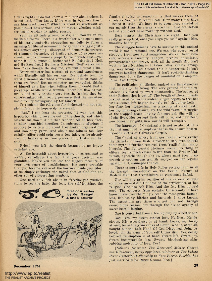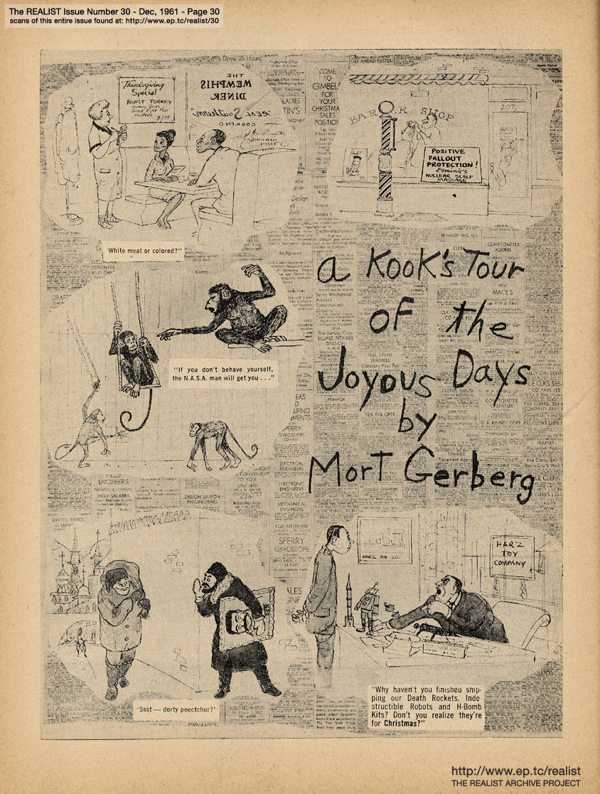 DECEMBER 1961 CONTENTS: Page 01: FROM A STUDY OF SALINGER: CONTROVERSY IN THE CATCHER by Donald M. Fiene and HOW I FORTIFIED MY FAMILY FALLOUT SHELTER by Marvin Kitman -- Page 02: THE MUSICAL COMEDY - A VOICE OF AMERICA? by Alan Casty -- Page 03: EDITORIAL TYPE STUFF - Ah Sordid Announcements - About the Author, for Chrissake - To the Memory of James Thurber -- Page 04: With Equal Time for All - No, Virginia, There Isn't a Sanity Clause -- Page 05: The Final Strains of Human Dignity - Department of Satirical Prophecy - Funny You Should Ask That - Realist-of-the-Year Award - Action, Si ... Label, No -- Page 06: The Good-Bad Guy - General Strike vs. Private Concern - Two Facts and a Rumor - The Lawsuit Bit - A Star Is Aborted -- Page 07: THE UNFABULOUS CIVIL WAR by Hiag Akmakjian and THE DAY EISENHOWER LIVED ... -- Page 08 -- Page 09 -- Page 10: GAMES FOR EXISTENTIALIST KIDS by Martin Berman -- Page 11 -- Page 12 -- Page 13: NEGATIVE THINKING by Robert Anton Wilson, Letter to a Man in Washington and OF GUARDS AND GUTS -- Page 14: LETTER FROM A SOLDIER'S WIFE by Lenny Bruce and THE DAILY LIE by James Higgins -- Page 15 -- Page 16 -- Page 17: UNDER THE COUNTER INTELLIGENCE by Jack Magarrell -- Page 18: THE POWER OF KINKY THINKING by Justin Smith -- Page 19: STOPOVER IN MIAMI by William Worthy -- Page 20: THE REALIST'S SOCIETY PAGE by Eileen Brand and EAST OF THE SOUTH by Dave Berkman -- Page 21 -- Page 22 -- Page 23 -- Page 24 -- Page 25 -- Page 26: MUSIC TO PHANTASIZE BY and I'VE GOT THE AUTHENTIC IDENTITY BLUES by Sylvia Dees -- Page 27: HOW TO WALK ON WATER by George von Hilsheimer -- Page 28: DEPARTMENT OF HMMMMM... -- Page 29: Cartoon, "J.C." by Ken Seagel and bhob stewart -- Page 30: THE KOOK'S TOUR OF THE JOYOUS DAYS by Mort Gerberg -- Page 31: THE 1961 EPISTLE PRIZES by Bob Abel and REQUIEM FOR A HEAD-HUNTER -- Back Cover: MODEST PROPOSALS by John Francis Putnam, New Wive's Tales for Old and NIGHTMARE ADLAI (Stevenson) by Jerry DeMuth