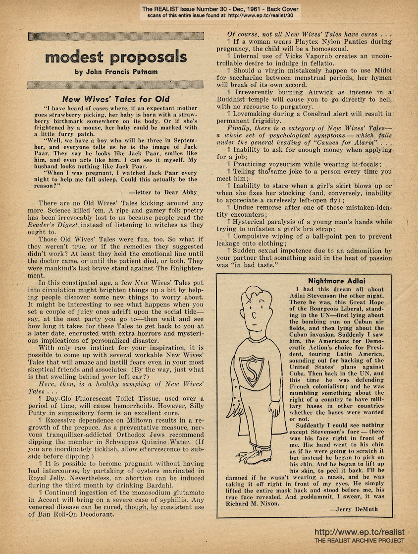 DECEMBER 1961 CONTENTS: Page 01: FROM A STUDY OF SALINGER: CONTROVERSY IN THE CATCHER by Donald M. Fiene and HOW I FORTIFIED MY FAMILY FALLOUT SHELTER by Marvin Kitman -- Page 02: THE MUSICAL COMEDY - A VOICE OF AMERICA? by Alan Casty -- Page 03: EDITORIAL TYPE STUFF - Ah Sordid Announcements - About the Author, for Chrissake - To the Memory of James Thurber -- Page 04: With Equal Time for All - No, Virginia, There Isn't a Sanity Clause -- Page 05: The Final Strains of Human Dignity - Department of Satirical Prophecy - Funny You Should Ask That - Realist-of-the-Year Award - Action, Si ... Label, No -- Page 06: The Good-Bad Guy - General Strike vs. Private Concern - Two Facts and a Rumor - The Lawsuit Bit - A Star Is Aborted -- Page 07: THE UNFABULOUS CIVIL WAR by Hiag Akmakjian and THE DAY EISENHOWER LIVED ... -- Page 08 -- Page 09 -- Page 10: GAMES FOR EXISTENTIALIST KIDS by Martin Berman -- Page 11 -- Page 12 -- Page 13: NEGATIVE THINKING by Robert Anton Wilson, Letter to a Man in Washington and OF GUARDS AND GUTS -- Page 14: LETTER FROM A SOLDIER'S WIFE by Lenny Bruce and THE DAILY LIE by James Higgins -- Page 15 -- Page 16 -- Page 17: UNDER THE COUNTER INTELLIGENCE by Jack Magarrell -- Page 18: THE POWER OF KINKY THINKING by Justin Smith -- Page 19: STOPOVER IN MIAMI by William Worthy -- Page 20: THE REALIST'S SOCIETY PAGE by Eileen Brand and EAST OF THE SOUTH by Dave Berkman -- Page 21 -- Page 22 -- Page 23 -- Page 24 -- Page 25 -- Page 26: MUSIC TO PHANTASIZE BY and I'VE GOT THE AUTHENTIC IDENTITY BLUES by Sylvia Dees -- Page 27: HOW TO WALK ON WATER by George von Hilsheimer -- Page 28: DEPARTMENT OF HMMMMM... -- Page 29: Cartoon, "J.C." by Ken Seagel and bhob stewart -- Page 30: THE KOOK'S TOUR OF THE JOYOUS DAYS by Mort Gerberg -- Page 31: THE 1961 EPISTLE PRIZES by Bob Abel and REQUIEM FOR A HEAD-HUNTER -- Back Cover: MODEST PROPOSALS by John Francis Putnam, New Wive's Tales for Old and NIGHTMARE ADLAI (Stevenson) by Jerry DeMuth