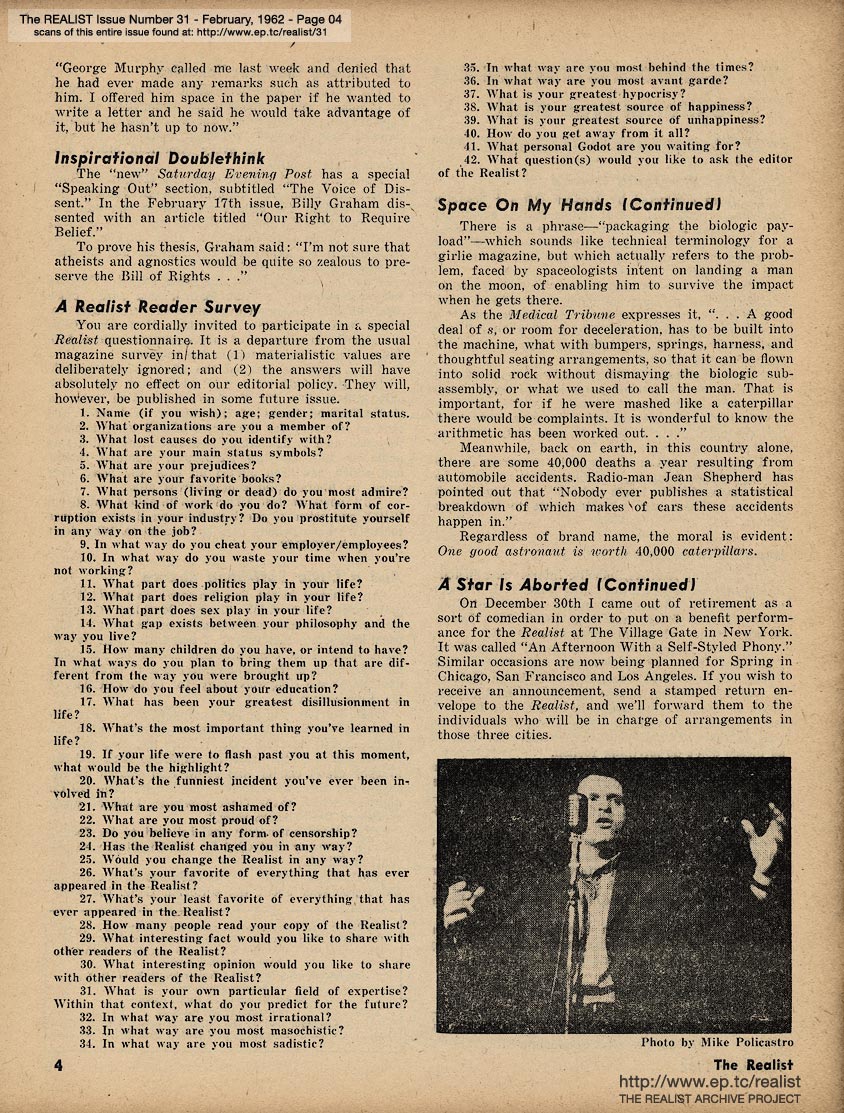 FEBRUARY 1962 CONTENTS: Page 01: THE F.B.I. IN PEACE AND COLD WAR by William Worthy and HOW TO HELP A BOPPING GANG GO SOCIAL by Paul Krassner -- Page 02 -- Page 03: EDITORIAL TYPE STUFF -- Page 04 -- Page 05 -- Page 06 -- Page 07 -- Page 08: REALIST FIRST READER: A CHILD'S PRIMER ON DIVORCE and The Last Word in Castro Convertibles -- Page 09: BUT ASK HIM MORE... by Roy Bongartz -- Page 10: Department of Double Entendre and Quoted Without Comment -- Page 11 -- Page 12 -- Page 13: TEACHER, MAY I PLEASE LEAVE THE ROOM? -- Page 14: For Better or For Worse -- Page 15: THE GAME OF "SURVIVAL" by Sally Baldwin -- Page 16 -- Page 17: AN IMPOLITE INTERVIEW WITH LENNY PERLMAN -- Page 18 -- Page 19 -- Page 20 -- Page 21 -- Page 22: THE LANGUAGE BARRIER IN ACTION -- Page 23 -- Page 24 -- Page 25 -- Page 26: CORE AND SURFACE by Lawrence Barth -- Page 27: DIABOLIC DIALOGUES by George Lincoln Rockwell and Mayor Robert Wagner and THE PROBLEM OF RETURNING VETERANS OF THE PEACE CORPS by Marvin Kitman -- Page 28 -- Page 29: J.C. by Ken Seagle and bhob stewart -- Page 30: IF THIS BE HERESY by Albert Ellis, Ph.D. and COPS THAT GO THUMP IN THE NIGHT - or, - THE PIECE CORPS IN CALIFORNIA by Maria di Savio -- Page 31: "... while our half of the class used the rhythm method" by Mort Gerberg -- Back Cover: WHO PUT THE WIENER IN MRS. K'S SCHNITZEL by John Boardman - SICK COLUMNIST - and "Jane ... I feel like the lowest ... dirtiest ... most rotten friend a guy ever had." by Dick Guindon