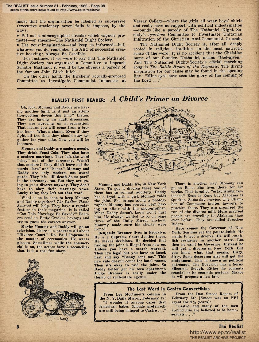 FEBRUARY 1962 CONTENTS: Page 01: THE F.B.I. IN PEACE AND COLD WAR by William Worthy and HOW TO HELP A BOPPING GANG GO SOCIAL by Paul Krassner -- Page 02 -- Page 03: EDITORIAL TYPE STUFF -- Page 04 -- Page 05 -- Page 06 -- Page 07 -- Page 08: REALIST FIRST READER: A CHILD'S PRIMER ON DIVORCE and The Last Word in Castro Convertibles -- Page 09: BUT ASK HIM MORE... by Roy Bongartz -- Page 10: Department of Double Entendre and Quoted Without Comment -- Page 11 -- Page 12 -- Page 13: TEACHER, MAY I PLEASE LEAVE THE ROOM? -- Page 14: For Better or For Worse -- Page 15: THE GAME OF "SURVIVAL" by Sally Baldwin -- Page 16 -- Page 17: AN IMPOLITE INTERVIEW WITH LENNY PERLMAN -- Page 18 -- Page 19 -- Page 20 -- Page 21 -- Page 22: THE LANGUAGE BARRIER IN ACTION -- Page 23 -- Page 24 -- Page 25 -- Page 26: CORE AND SURFACE by Lawrence Barth -- Page 27: DIABOLIC DIALOGUES by George Lincoln Rockwell and Mayor Robert Wagner and THE PROBLEM OF RETURNING VETERANS OF THE PEACE CORPS by Marvin Kitman -- Page 28 -- Page 29: J.C. by Ken Seagle and bhob stewart -- Page 30: IF THIS BE HERESY by Albert Ellis, Ph.D. and COPS THAT GO THUMP IN THE NIGHT - or, - THE PIECE CORPS IN CALIFORNIA by Maria di Savio -- Page 31: "... while our half of the class used the rhythm method" by Mort Gerberg -- Back Cover: WHO PUT THE WIENER IN MRS. K'S SCHNITZEL by John Boardman - SICK COLUMNIST - and "Jane ... I feel like the lowest ... dirtiest ... most rotten friend a guy ever had." by Dick Guindon