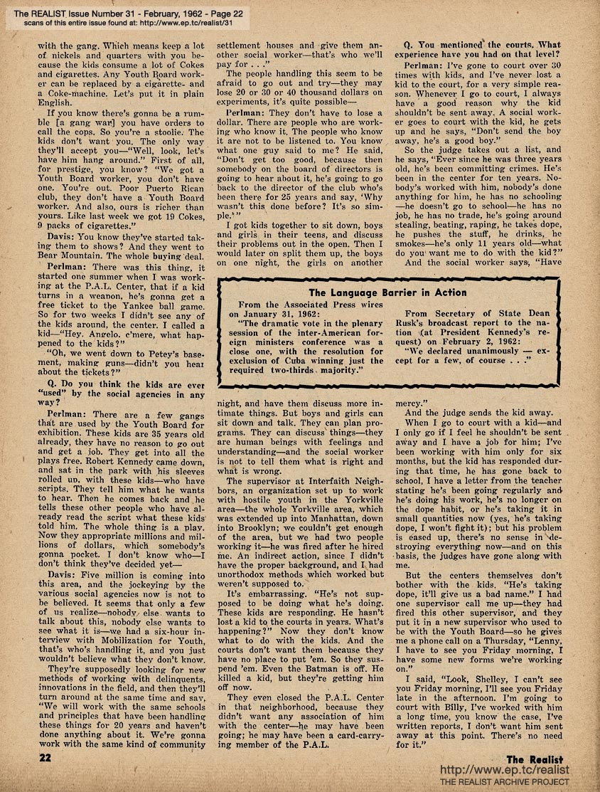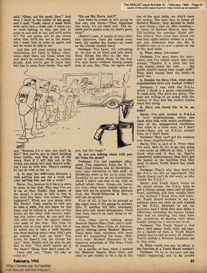 FEBRUARY 1962 CONTENTS: Page 01: THE F.B.I. IN PEACE AND COLD WAR by William Worthy and HOW TO HELP A BOPPING GANG GO SOCIAL by Paul Krassner -- Page 02 -- Page 03: EDITORIAL TYPE STUFF -- Page 04 -- Page 05 -- Page 06 -- Page 07 -- Page 08: REALIST FIRST READER: A CHILD'S PRIMER ON DIVORCE and The Last Word in Castro Convertibles -- Page 09: BUT ASK HIM MORE... by Roy Bongartz -- Page 10: Department of Double Entendre and Quoted Without Comment -- Page 11 -- Page 12 -- Page 13: TEACHER, MAY I PLEASE LEAVE THE ROOM? -- Page 14: For Better or For Worse -- Page 15: THE GAME OF "SURVIVAL" by Sally Baldwin -- Page 16 -- Page 17: AN IMPOLITE INTERVIEW WITH LENNY PERLMAN -- Page 18 -- Page 19 -- Page 20 -- Page 21 -- Page 22: THE LANGUAGE BARRIER IN ACTION -- Page 23 -- Page 24 -- Page 25 -- Page 26: CORE AND SURFACE by Lawrence Barth -- Page 27: DIABOLIC DIALOGUES by George Lincoln Rockwell and Mayor Robert Wagner and THE PROBLEM OF RETURNING VETERANS OF THE PEACE CORPS by Marvin Kitman -- Page 28 -- Page 29: J.C. by Ken Seagle and bhob stewart -- Page 30: IF THIS BE HERESY by Albert Ellis, Ph.D. and COPS THAT GO THUMP IN THE NIGHT - or, - THE PIECE CORPS IN CALIFORNIA by Maria di Savio -- Page 31: "... while our half of the class used the rhythm method" by Mort Gerberg -- Back Cover: WHO PUT THE WIENER IN MRS. K'S SCHNITZEL by John Boardman - SICK COLUMNIST - and "Jane ... I feel like the lowest ... dirtiest ... most rotten friend a guy ever had." by Dick Guindon