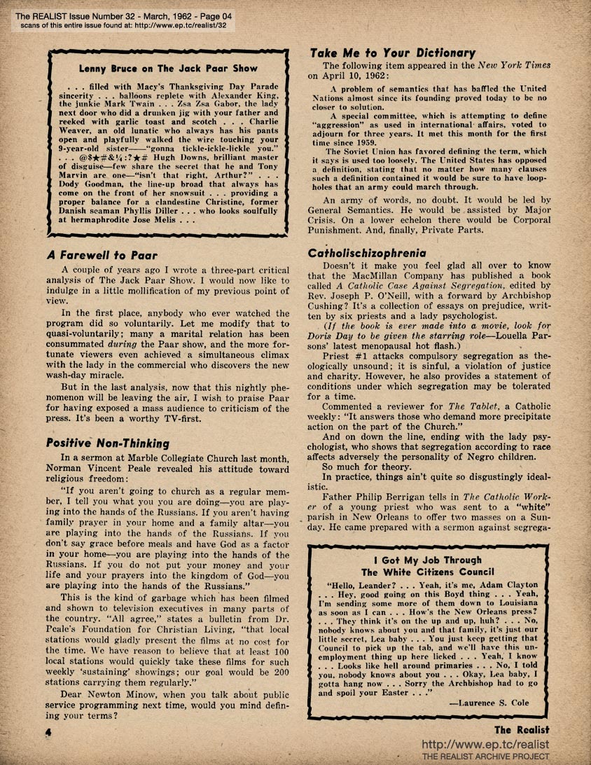 MARCH 1962 CONTENTS: Page 01: SHOULD VIOLENCE BE MET WITH VIOLENCE? by John C. Lowry, The Story Behind The Rumor About President Kennedy's First Marriage..., and IS THERE SEX LIFE IN OUTER SPACE? by Bob Abel -- Page 02: EDITORIAL TYPE STUFF -- Page 03 -- Page 04 -- Page 05 -- Page 06 -- Page 07 -- Page 08 -- Page 09 -- Page 10: MODEST PROPOSALS by John Francis Putnam and A VISIT FROM THE F.B.I. by William Worthy -- Page 11 -- Page 12 -- Page 13: DOUBLE ENTENDRE OF THE MONTH -- Page 14: NO WAR TODAY by Michael Valenti -- Page 15: The TREND IS TOWARD DIRTY by Peter Edler -- Page 16: The AUTOMOBILE AS A VEHICLE OF DEMOCRACY by T. D. C. Kuch -- Page 17: THE REALIST READER SURVEY -- Page 18 -- Page 19 -- Page 20 -- Page 21 -- Page 22 -- Page 23: MASS MEDIOCRITY by Dave Berkman -- Back Cover: QUOTED WITHOUT COMMENT ...