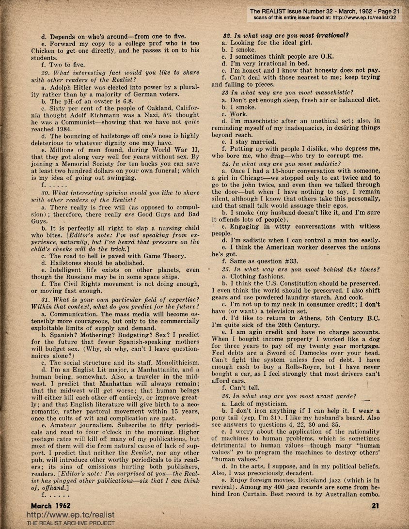 MARCH 1962 CONTENTS: Page 01: SHOULD VIOLENCE BE MET WITH VIOLENCE? by John C. Lowry, The Story Behind The Rumor About President Kennedy's First Marriage..., and IS THERE SEX LIFE IN OUTER SPACE? by Bob Abel -- Page 02: EDITORIAL TYPE STUFF -- Page 03 -- Page 04 -- Page 05 -- Page 06 -- Page 07 -- Page 08 -- Page 09 -- Page 10: MODEST PROPOSALS by John Francis Putnam and A VISIT FROM THE F.B.I. by William Worthy -- Page 11 -- Page 12 -- Page 13: DOUBLE ENTENDRE OF THE MONTH -- Page 14: NO WAR TODAY by Michael Valenti -- Page 15: The TREND IS TOWARD DIRTY by Peter Edler -- Page 16: The AUTOMOBILE AS A VEHICLE OF DEMOCRACY by T. D. C. Kuch -- Page 17: THE REALIST READER SURVEY -- Page 18 -- Page 19 -- Page 20 -- Page 21 -- Page 22 -- Page 23: MASS MEDIOCRITY by Dave Berkman -- Back Cover: QUOTED WITHOUT COMMENT ...